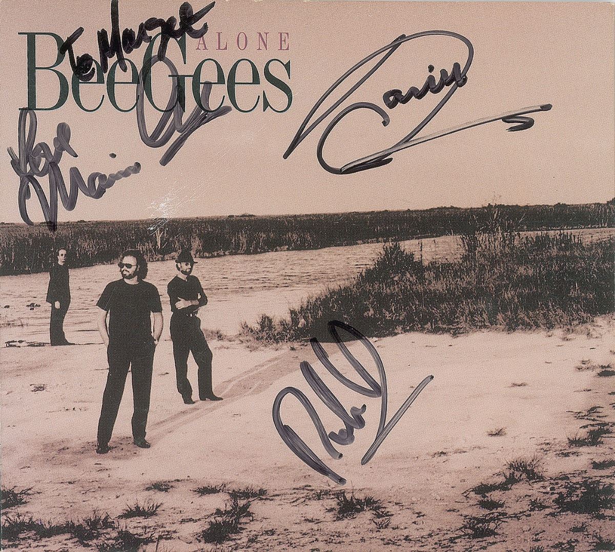‘Alone’ single CD signed on the front cover in black felt tip by Barry, Robin, and Maurice Gibb, with one adding a brief inscription at the top. In fine condition, with some slight rubbing. The CD is included.