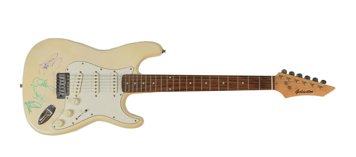 Cream-bodied Galveston right-handed stratocaster-style electric guitar, signed on the body in green felt tip, "Robin" and "Love, Maurice Gibb," and in purple felt tip, "Barry." Includes gig bag. In fine condition.