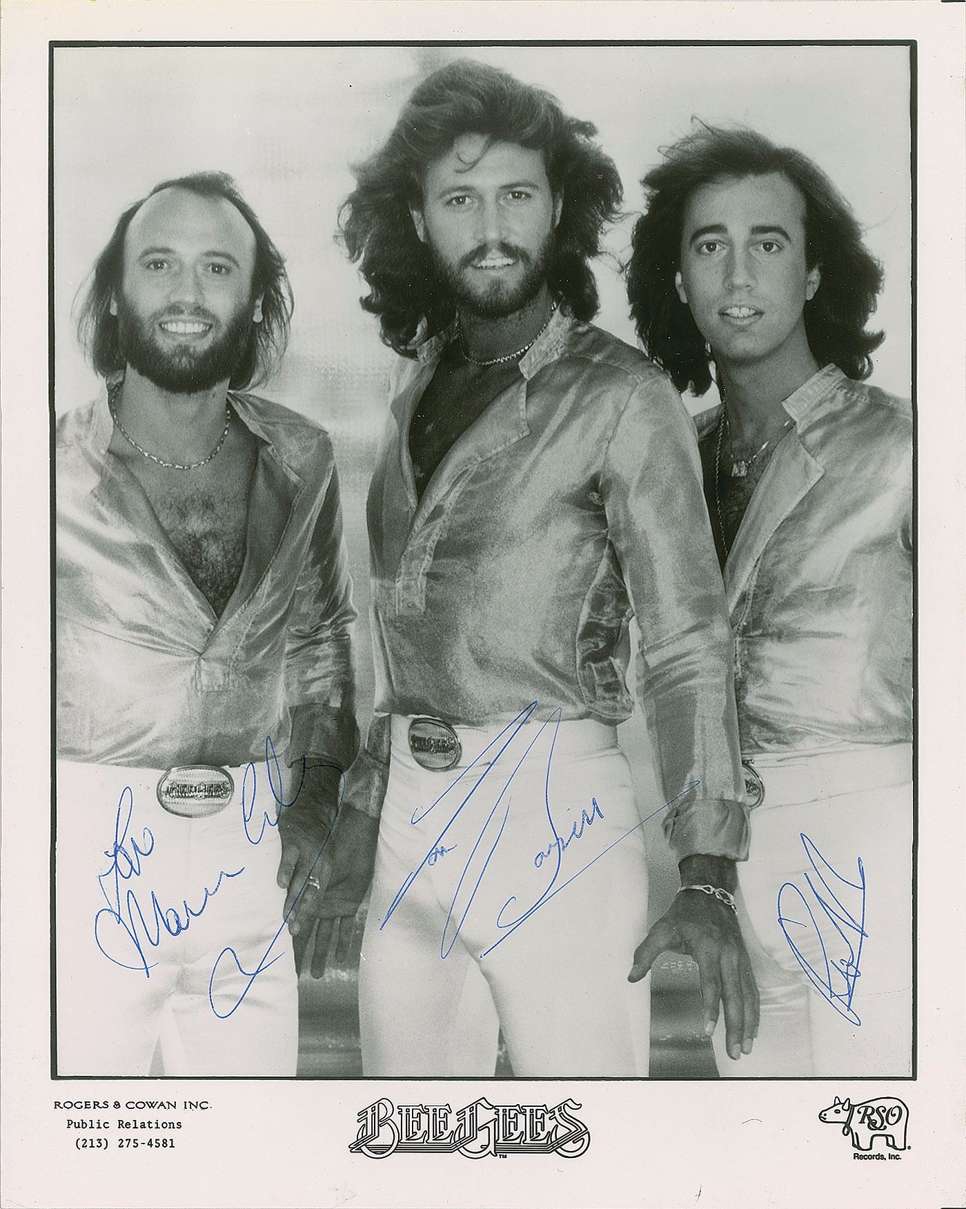 Glossy 8 x 10 RSO publicity photo of the Bee Gees in matching outfits, signed in blue ballpoint, "Love, Maurice Gibb," "Love, Barry," and "Robin Gibb." In fine condition.