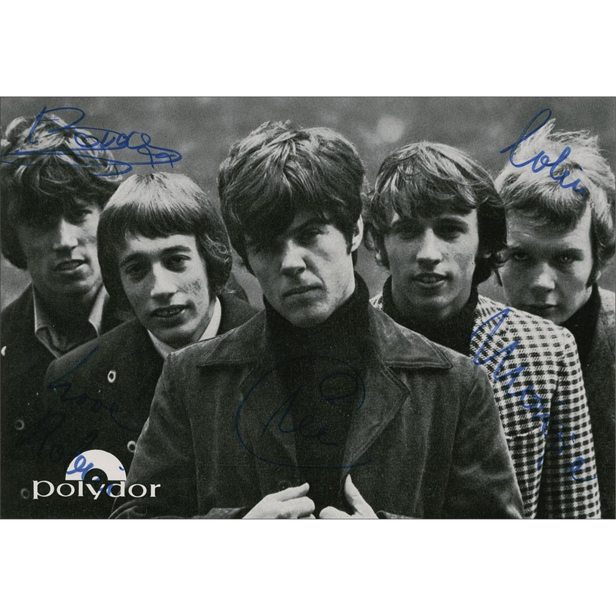 Promotional 5.75 x 4 Polydor Records cardstock photo, signed in blue felt tip by Barry, Robin, and Maurice Gibb, as well as Colin Petersen and Vince Melouney. Light to moderate contrast to Robin’s, Maurices’s, and Melouney’s signatures, otherwise fine condition.