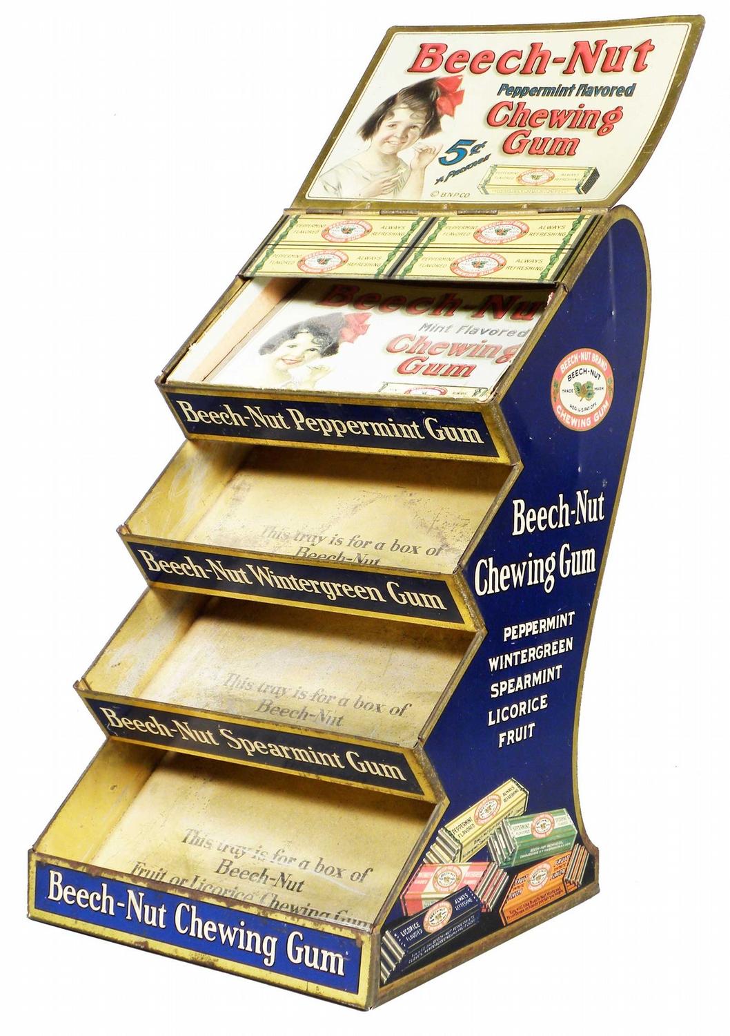 Beech-Nut Chewing Gum Tin Store Display. Comes with one empty box. Excellent condition. 6 1/2 X 14 X 6 1/2 inches.
