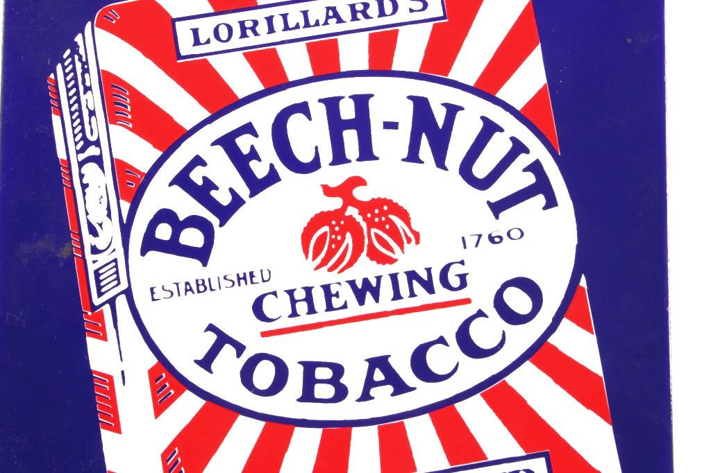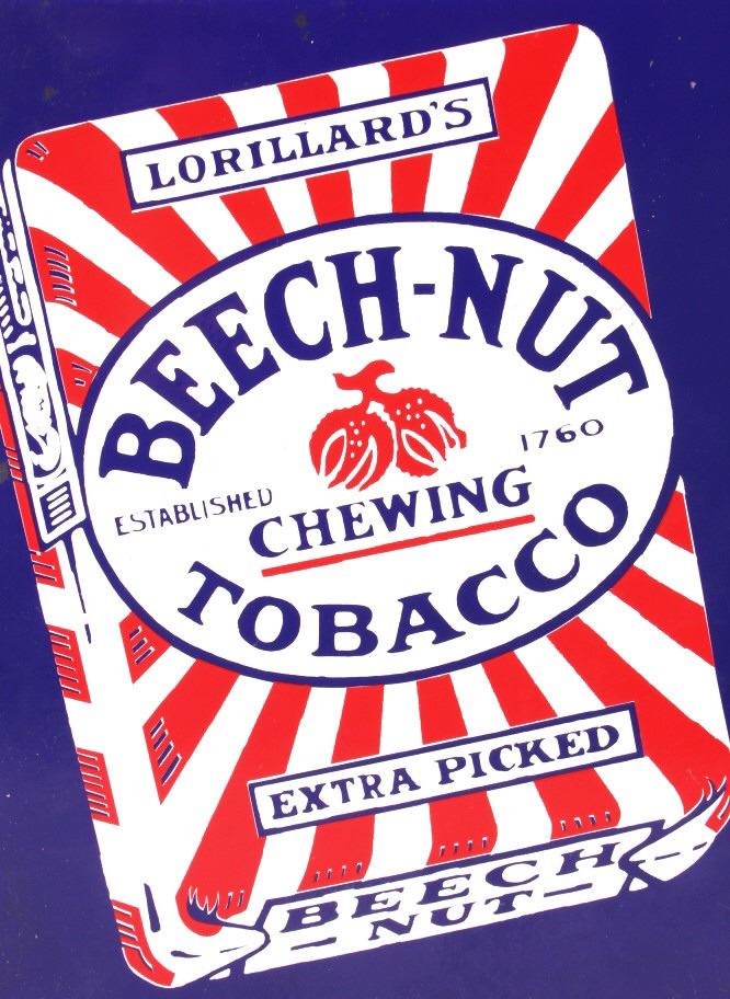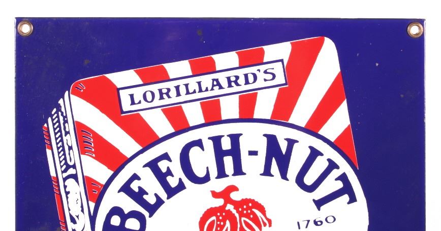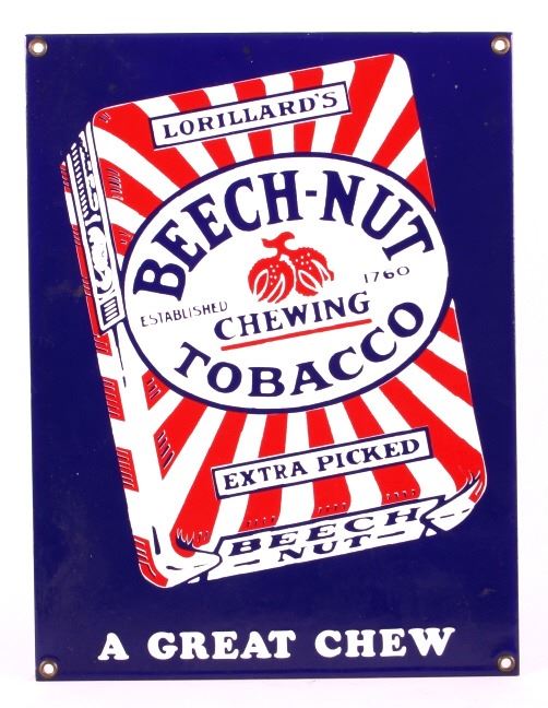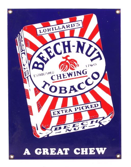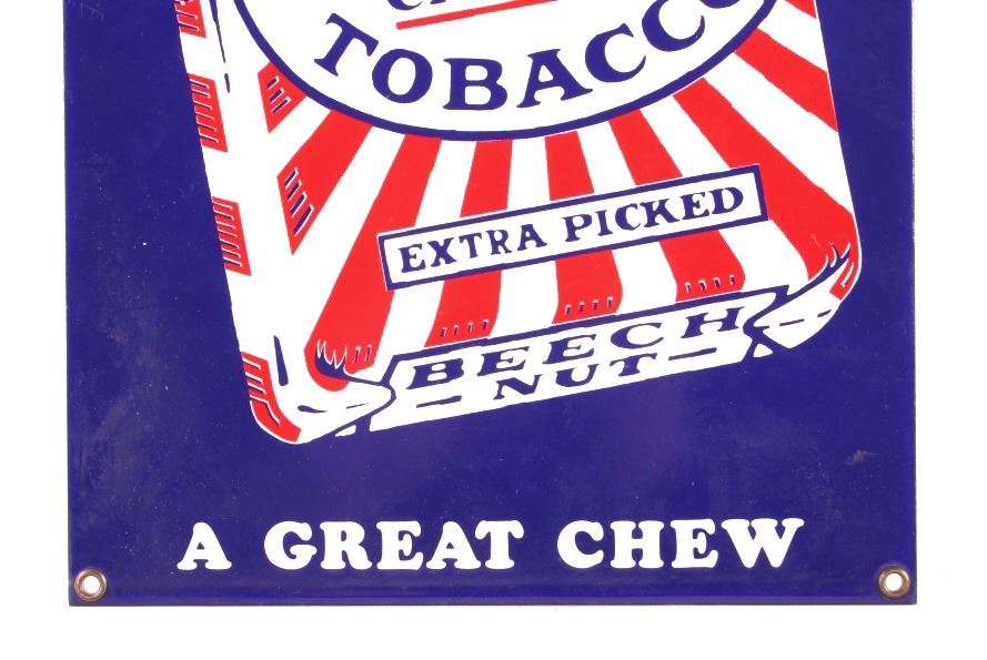 This is a Beech Nut Tobacco porcelain enamel sign. The sign shows a tobacco pouch graphic and reads "A Great Chew". The sign is in very good condition. It measures 9" x 12".