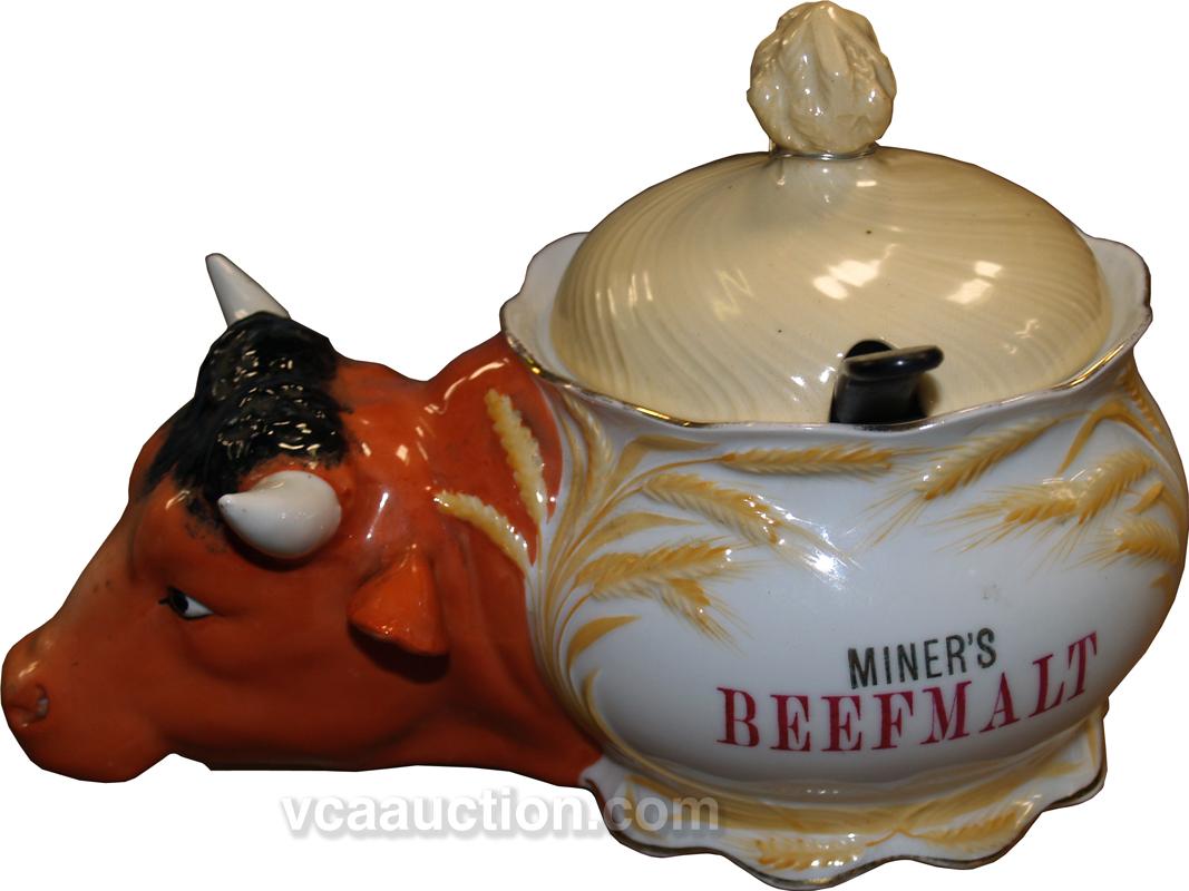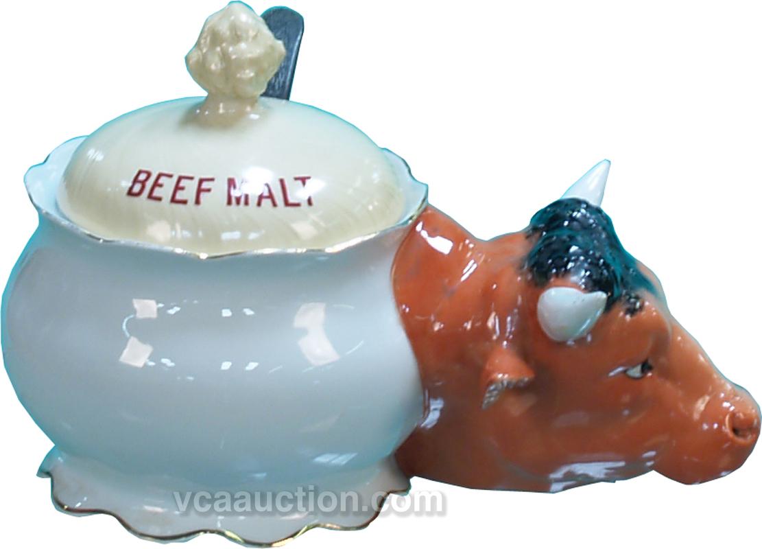 "Beef Mault" Countertop Ceramic Gravy/Liquid Container w/ Lid & Spoon, in shape of bulls head, stamped on bottom "Patented Jan. 8, 1907"