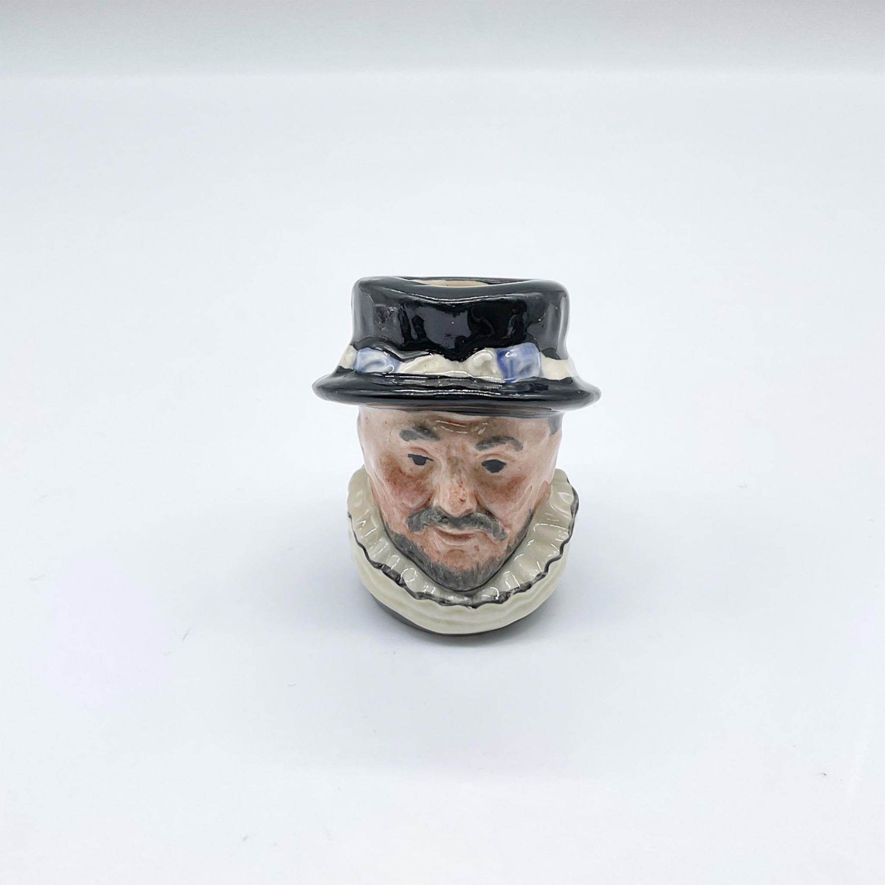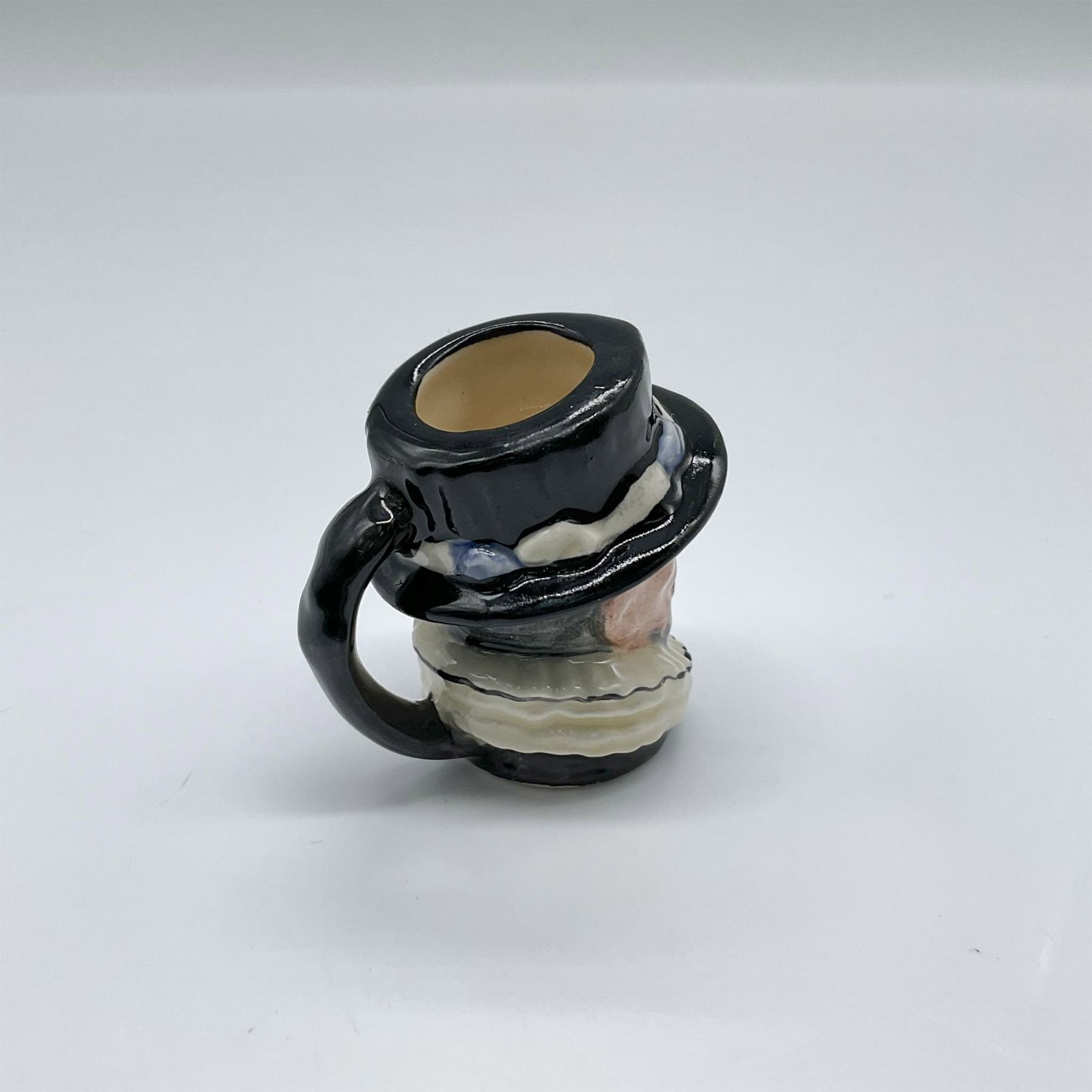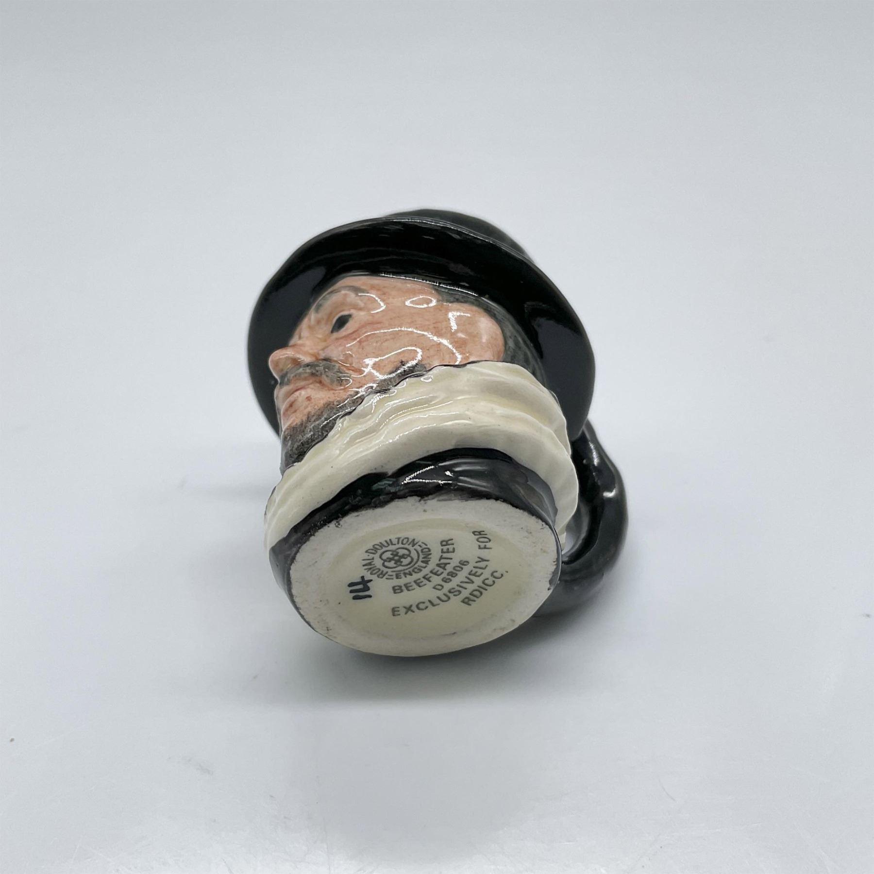 Hand painted tiny figural jug of a Yeomen Warder in a black tunic, white ruffled collar with a black accent, and black hat with white and pale blue flowers. Royal Doulton backstamp. Marked Exclusively for RDICC.