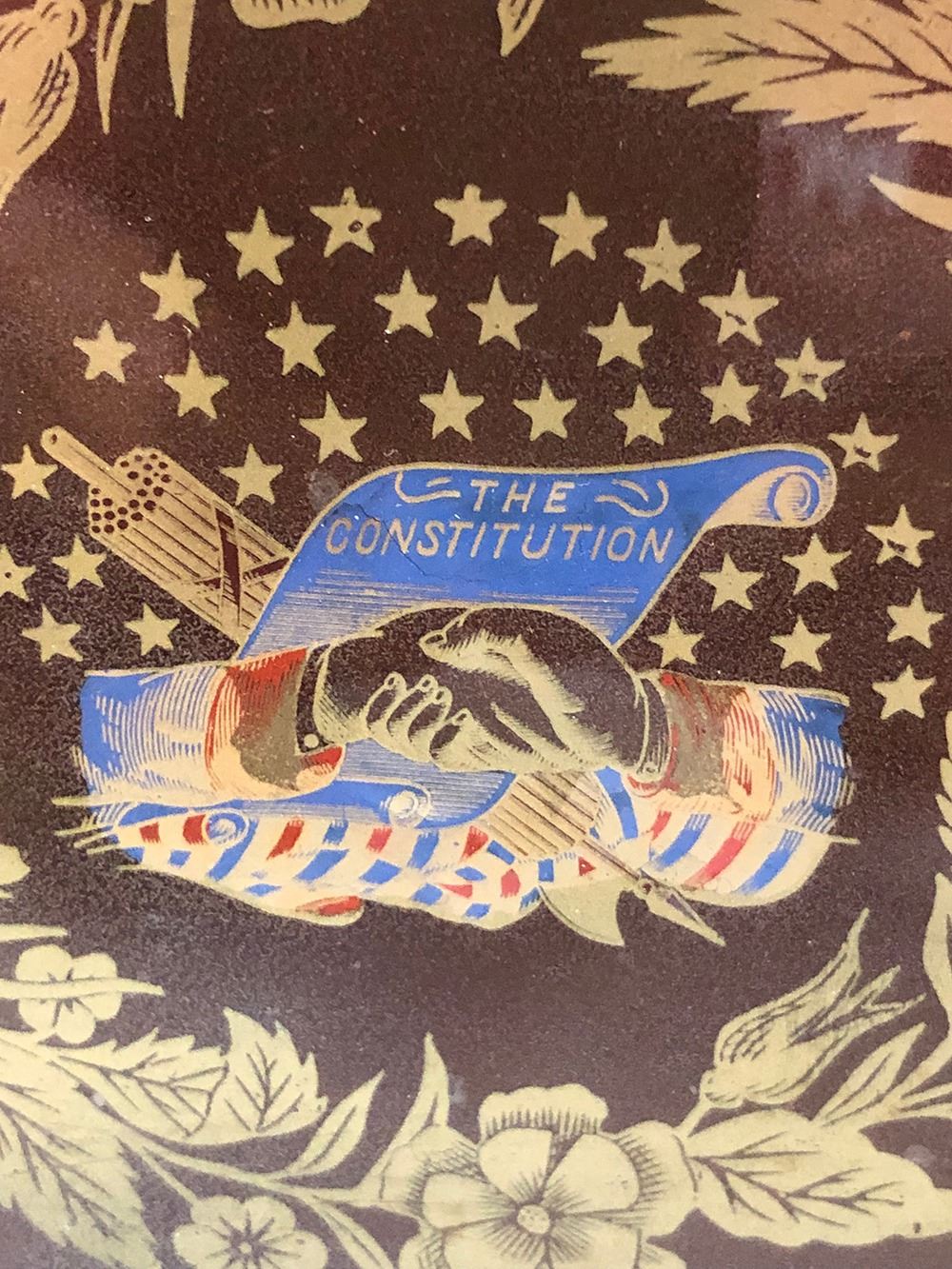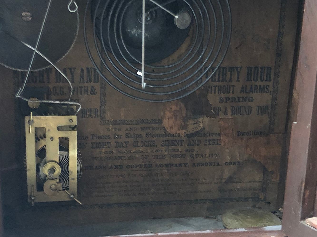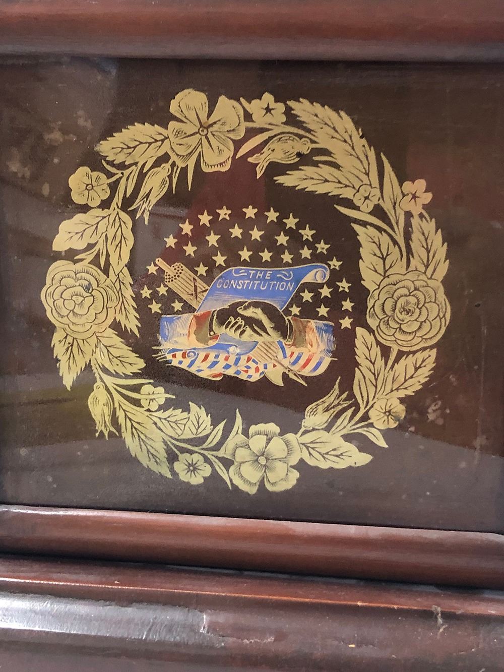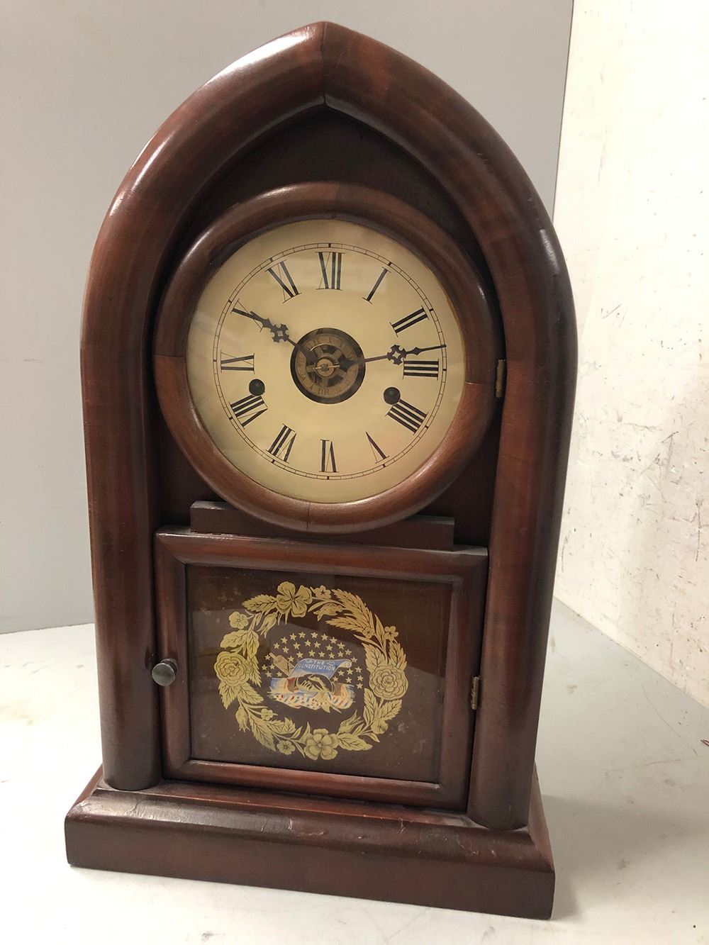 Beehive Shelf Clock, Brass and Copper Company, Ansonia, Connecticut maker, wonderful painting on lower glass, The Constitution, has alarm, all original. Was in running condition at the estate. From the Chatham, Ma, Cape Cod Collection.