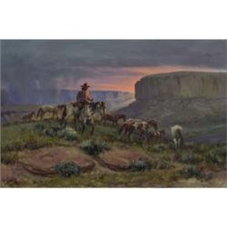 Beeler's painting portrays an Indian herdsman driving his stable of horses home. Beeler took special care to portray the Indian and his accoutrements accurately, including the finely crafted silver concho belt, saddle blanket, and bed roll over the back of the horse. Beeler must have considered <i>Almost Home</i> a significant work. The painting is featured as one of eight color illustrations in his book <i>Cowboys and Indians,</i> the first monograph dedicated to a twentieth century Western artist. -KK
