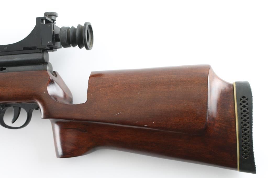 SN: 0601A20255. Chinese made , bolt action, Co2 powered, target air rifle, 27" barrel with globe front sight, and rear aperture peep sight with rubber eye cup, manual safety, rubber recoil pad, ported wood stock, with contoured pistol grip for right handed shooting. Appears to function, but could nut test it, no C02 cartridges. Very good condition. "Antique" Firearm