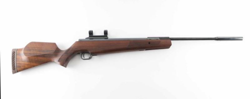 High quality air rifle marked "Made in England" & "Theoben", imported by Beeman. Features blued finish, checkered wood stock with fancy figure, ventilated rubber recoil pad, barrel cocking spring powered action, 19" long barrel with muzzle weight, manual safety inside triggerguard, raised base with scope rings (no scope provided), no provision for iron sights. Rifle is in beautiful condition, few minor handling marks. Condition is Excellent - like new *** Non Firearm - Air Rifle ***