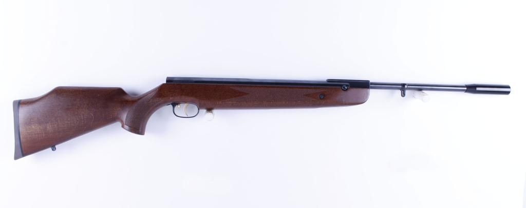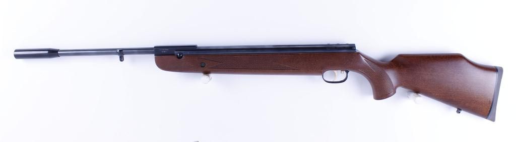 Quality German made break barrel air gun with weighted end on barrel. Blued finish, checkered Monte Carlo wood stock, Spring piston, adjustable trigger and sling swivels. No sights. Condition: Excellent.