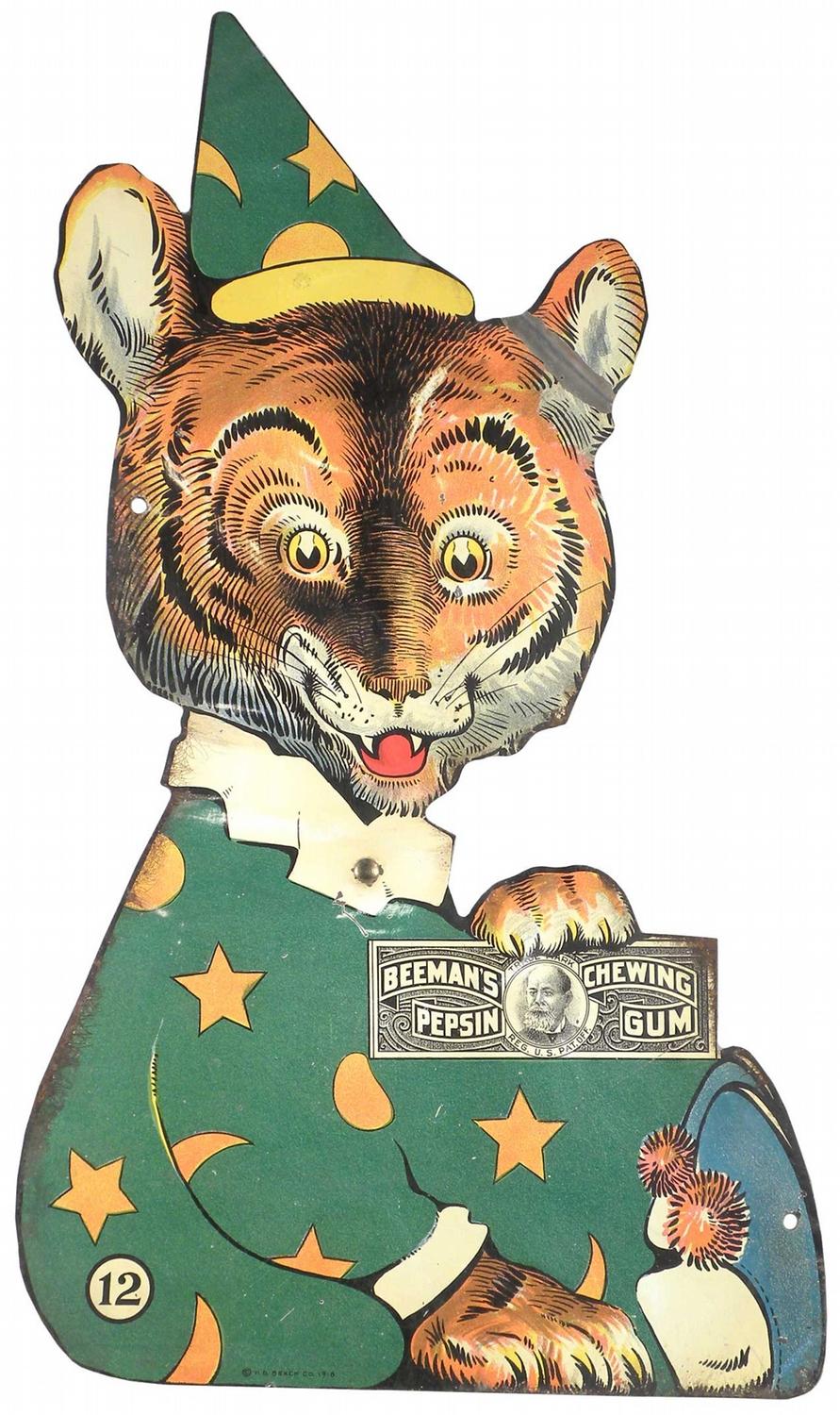 Beeman's Pepsin Chewing Gum Die Cut Tin Easel Back Sign. #12 depicts Tiger in a Wizard's hat. H.D. Beach Litho Co. 1916. Excellent condition. 6 1/4 X 8 3/4 inches. Edge ware on right side and paint loss at fold on right ear otherwise good condition. 7 X 12 inches.