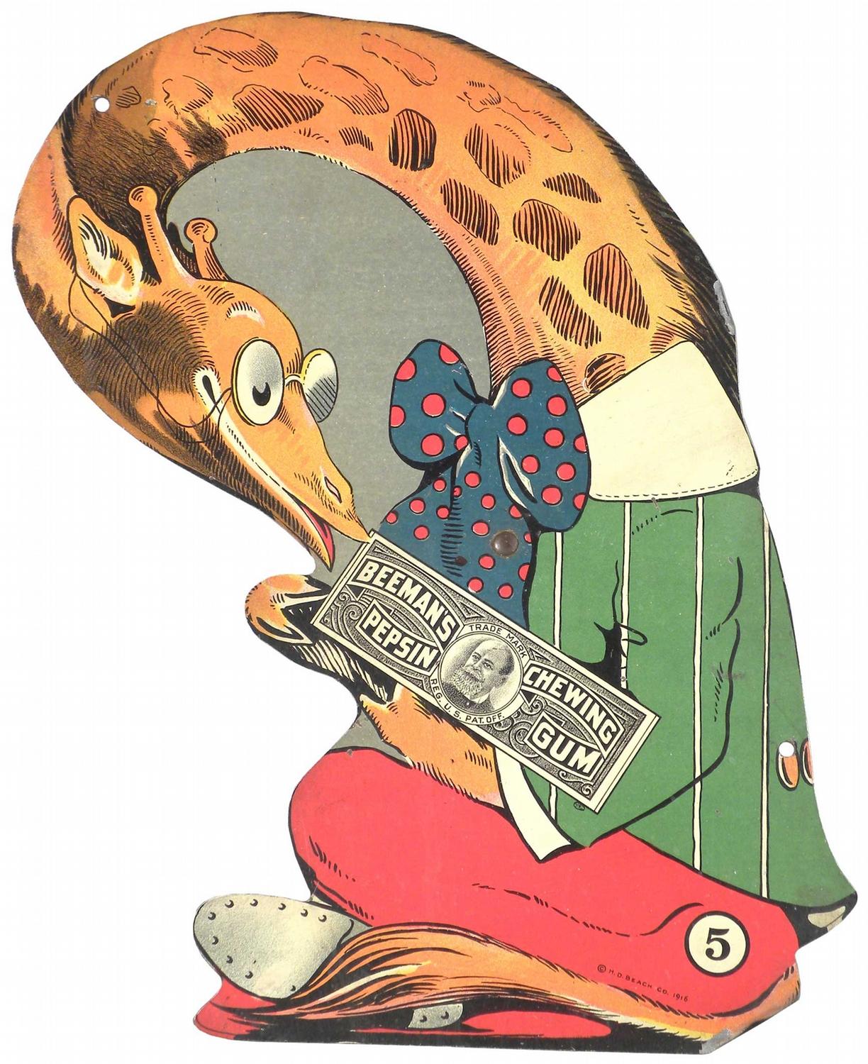 Beeman's Pepsin Chewing Gum Die Cut Tin Easel Back Sign. H.D. Beach Litho. Co. 1916. #5 depicts Giraffe with spectacles and a box tie. Very minor wrinkles and bottom right corner bent slightly otherwise very good condition. 6 X 9 3/4 inches.