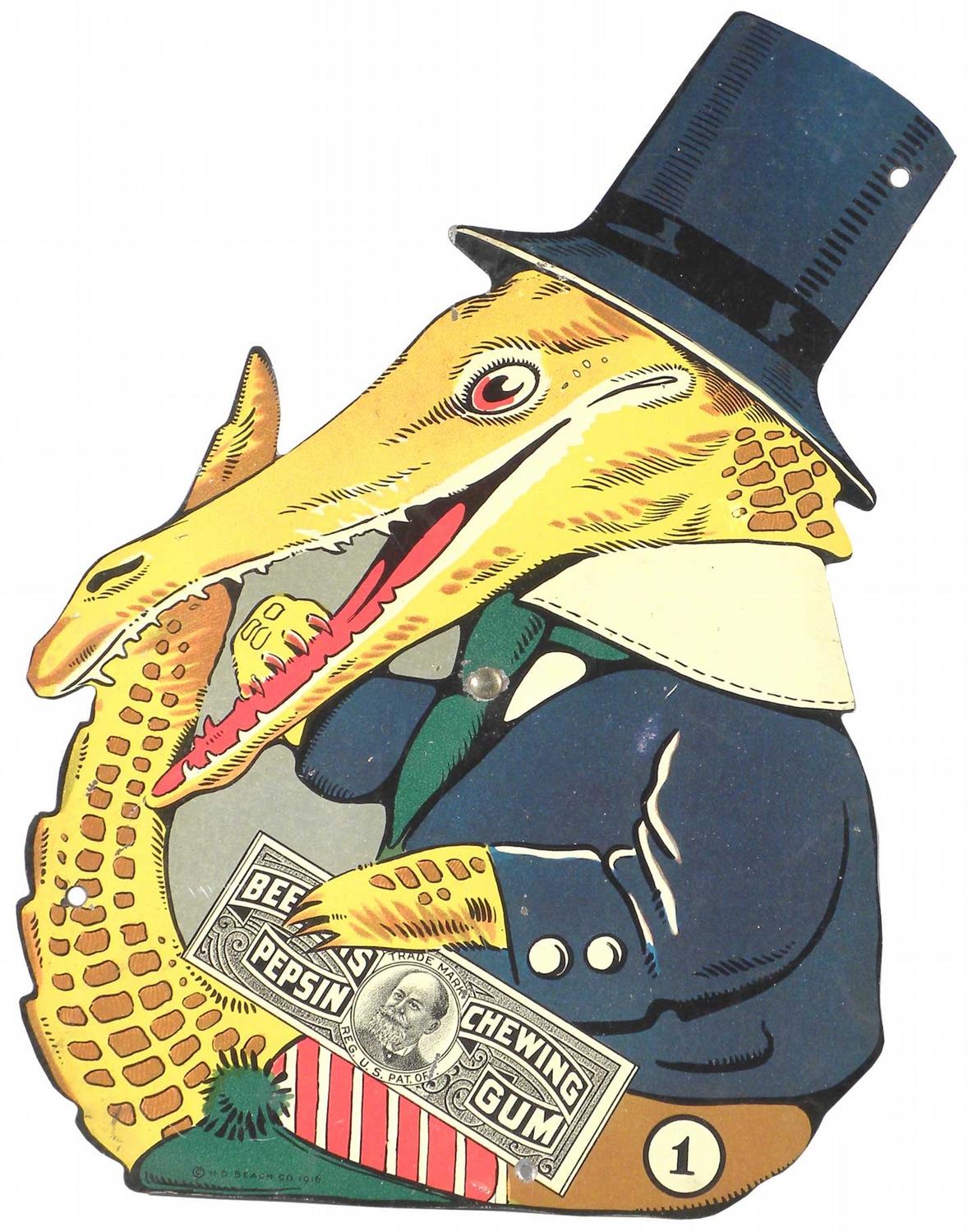 Beeman's Pepsin Chewing Gum Die Cut Tin Easel Back Sign. H.D. Beach Litho. Co. 1916. #1 depicts Alligator in a top hat. Excellent condition. 6 1/4 X 8 3/4 inches.
