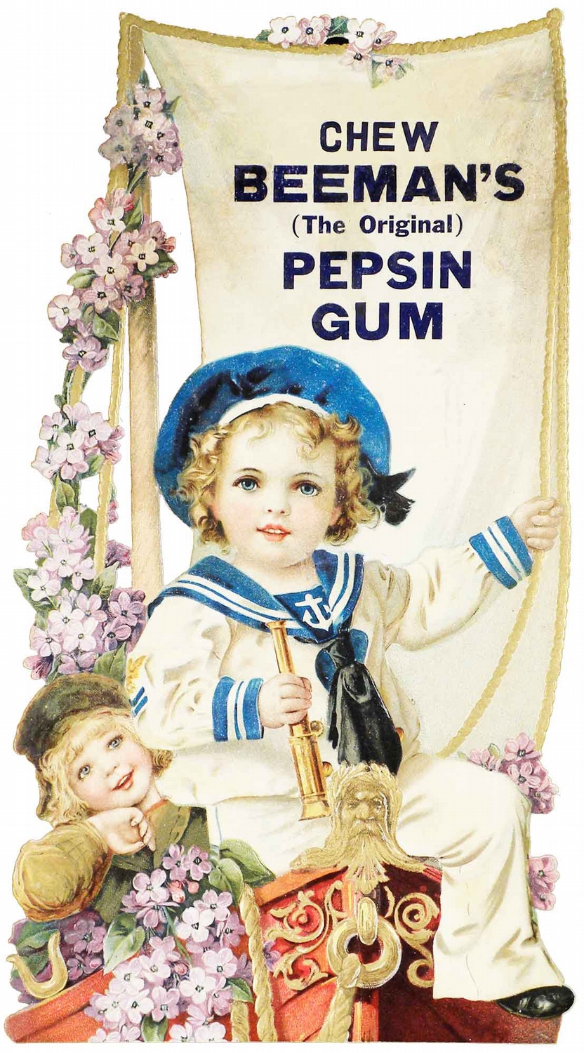 Beeman's Pepsin Gum Embossed Die Cut Cardboard Sign. Depicting children in boat with Neptune front. Framed and matted under glass. Very slight staining otherwise excellent condition. 17 3/4 X 13 3/4 inches.