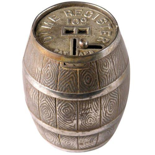 Nickel plated cast iron, Dime Register Bank in the shape of a beer barrel. Some of the nickel worn otherwise very good condition. 4 inches tall.