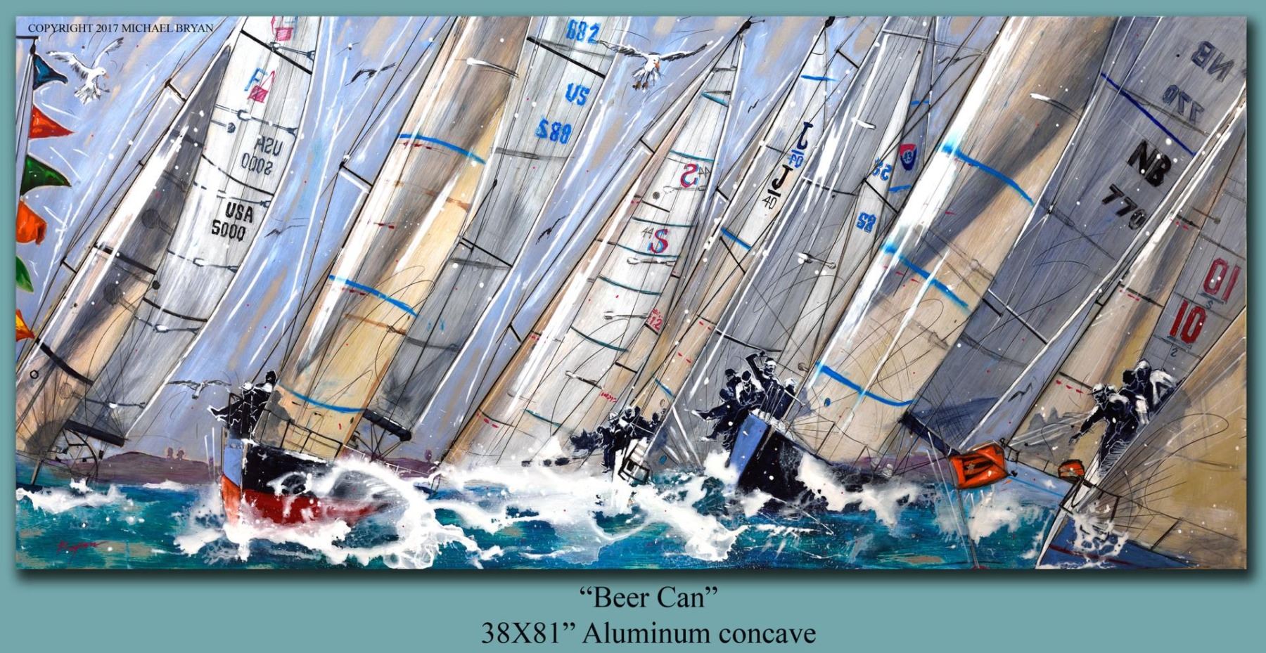 Michael Bryan captures the excitement and motion of the "Beer Can Races" at Newport Beach, California, in this 18x40" hand-worked giclee on canvas numbered 1/1 Unique.