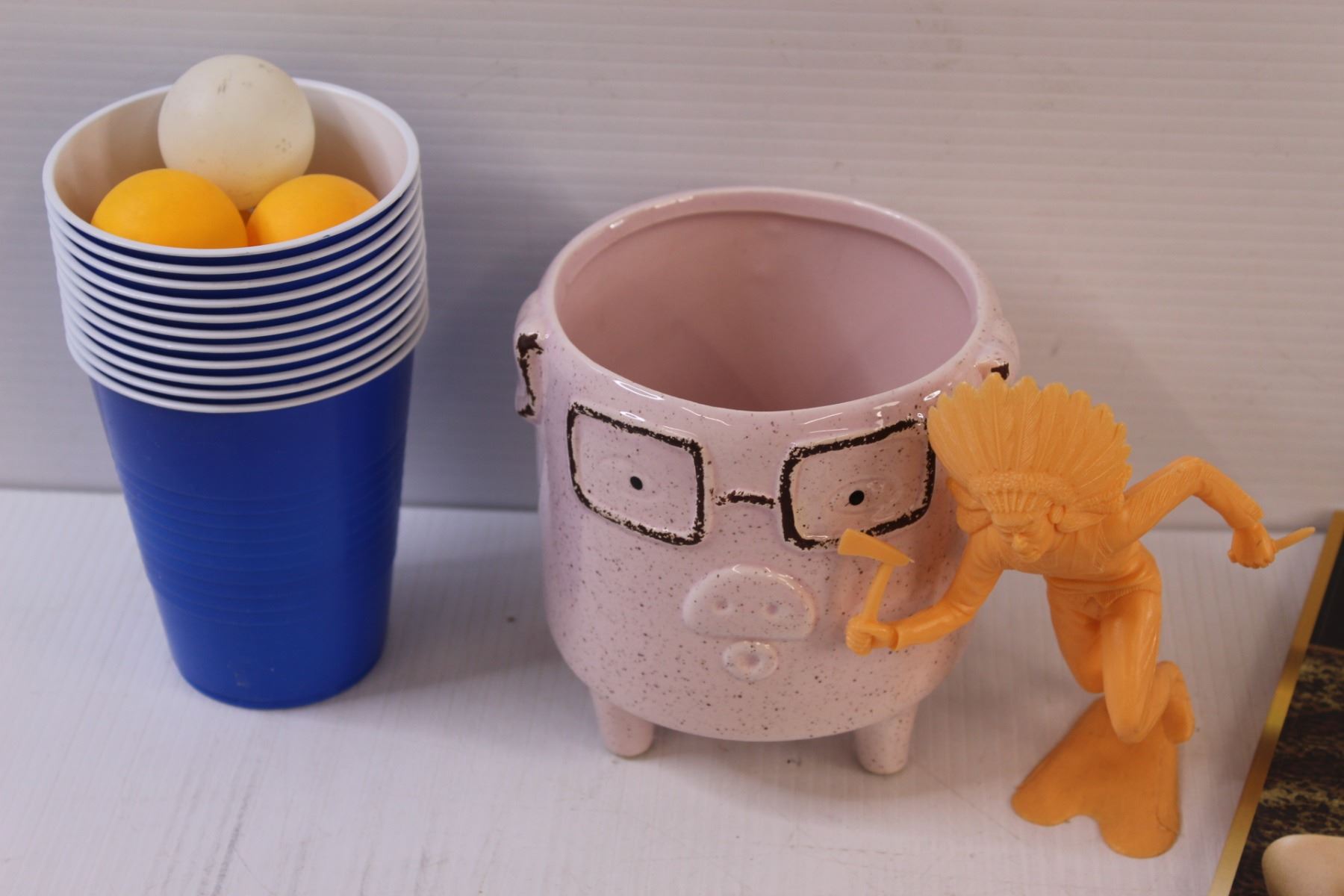 Beer Pong, Piggy Planter, Lesbian Card Games Book & Louis Marx Indigenous Figurine