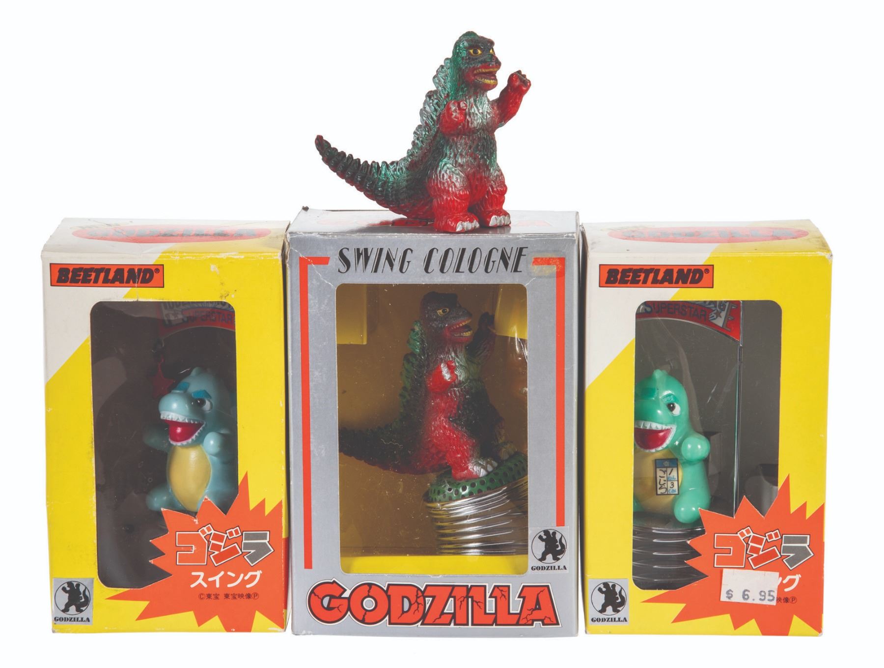 1983. Beetland Godzilla Swing Boxed Figure Lot of 3 Vinyl Figures. Misc "Swing Pets" and a "Swing Cologne" dispenser.