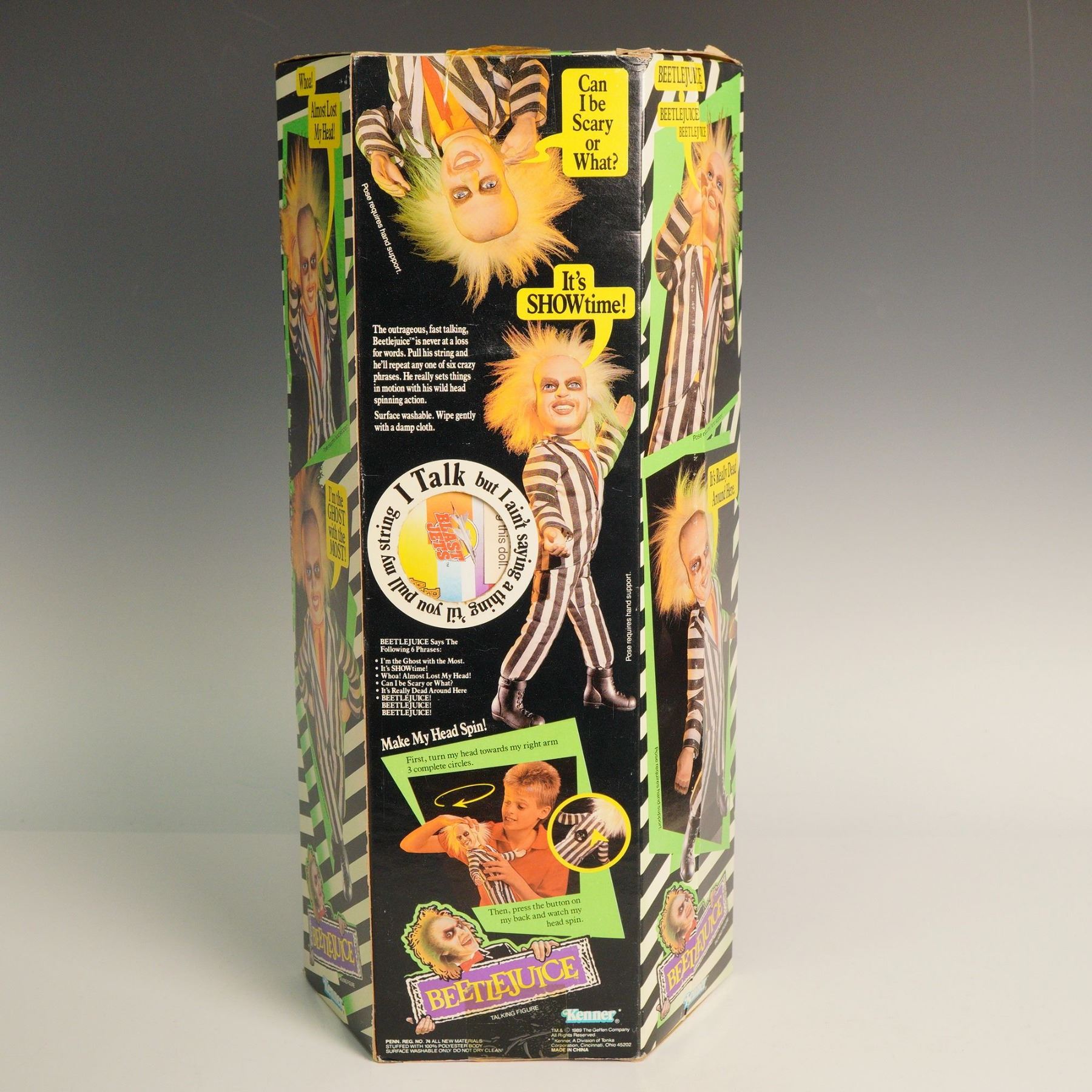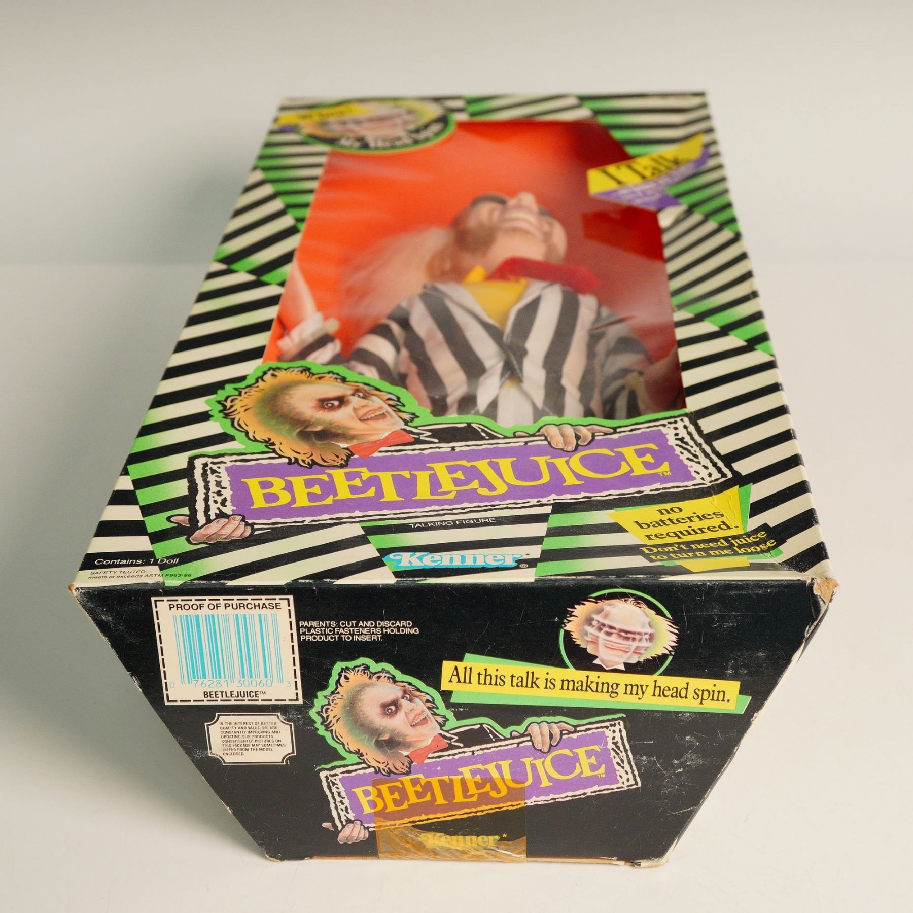 This Beetlejuice talking figure produced by Kenner is a must have collectible for fans of the 1988 cult classic film. Featuring the iconic character in his striped suit the figure speaks lines from the movie adding an interactive element to your collection. The box features vibrant graphics and fun phrases along with a unique talking mechanism that requires no batteries. The figure captures Beetlejuice's quirky charm and is sure to be a nostalgic piece for any collector of movie memorabilia.