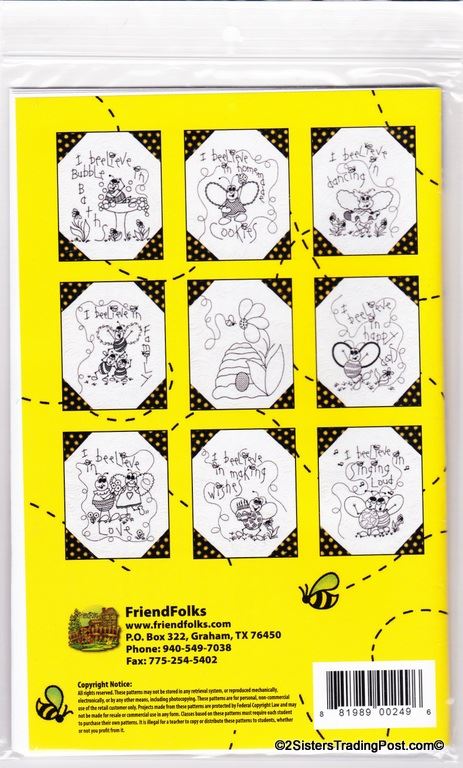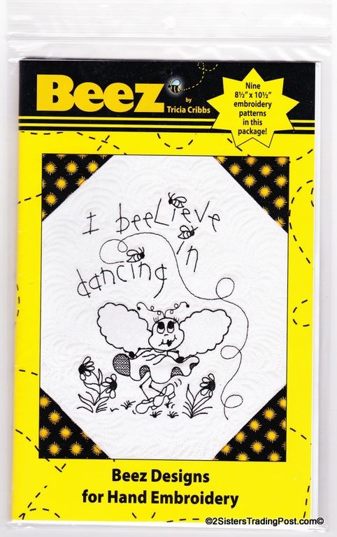 Hand embroidery designs of 'Beez' by Tricia Cribbs for FriendFolks. Pattern includes directions for 9 - 8.5" x 10.5" designs. MSRP $5.00