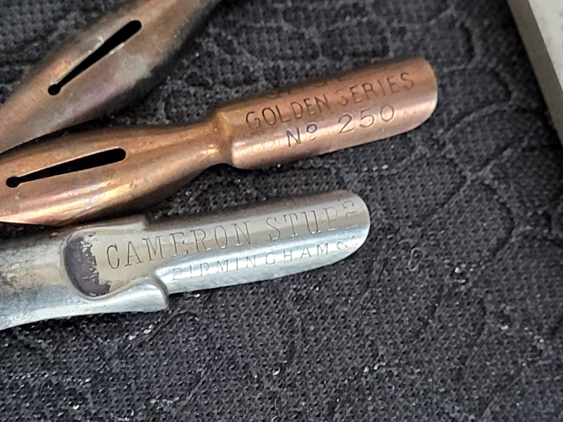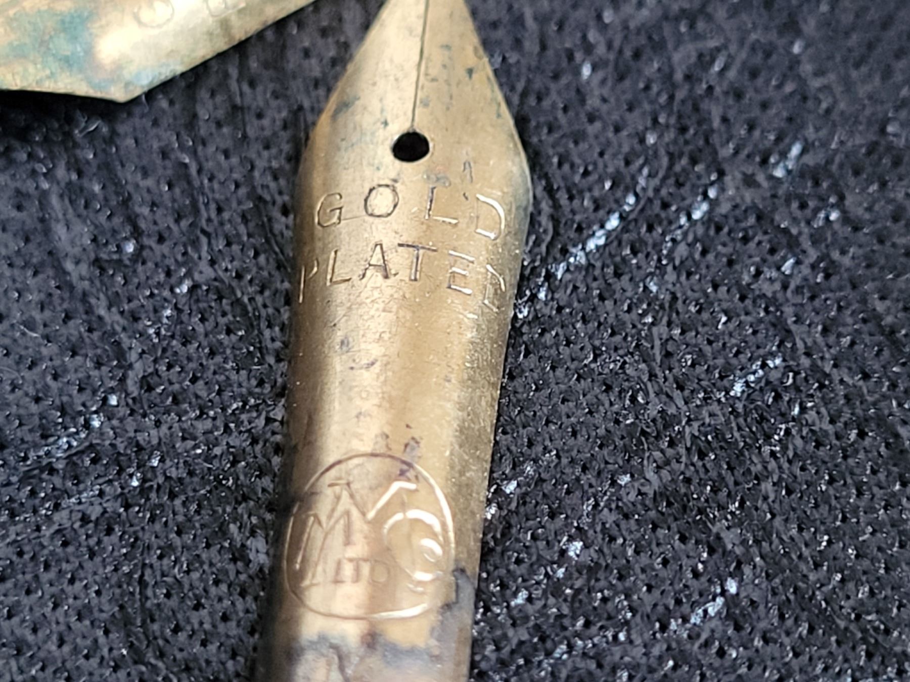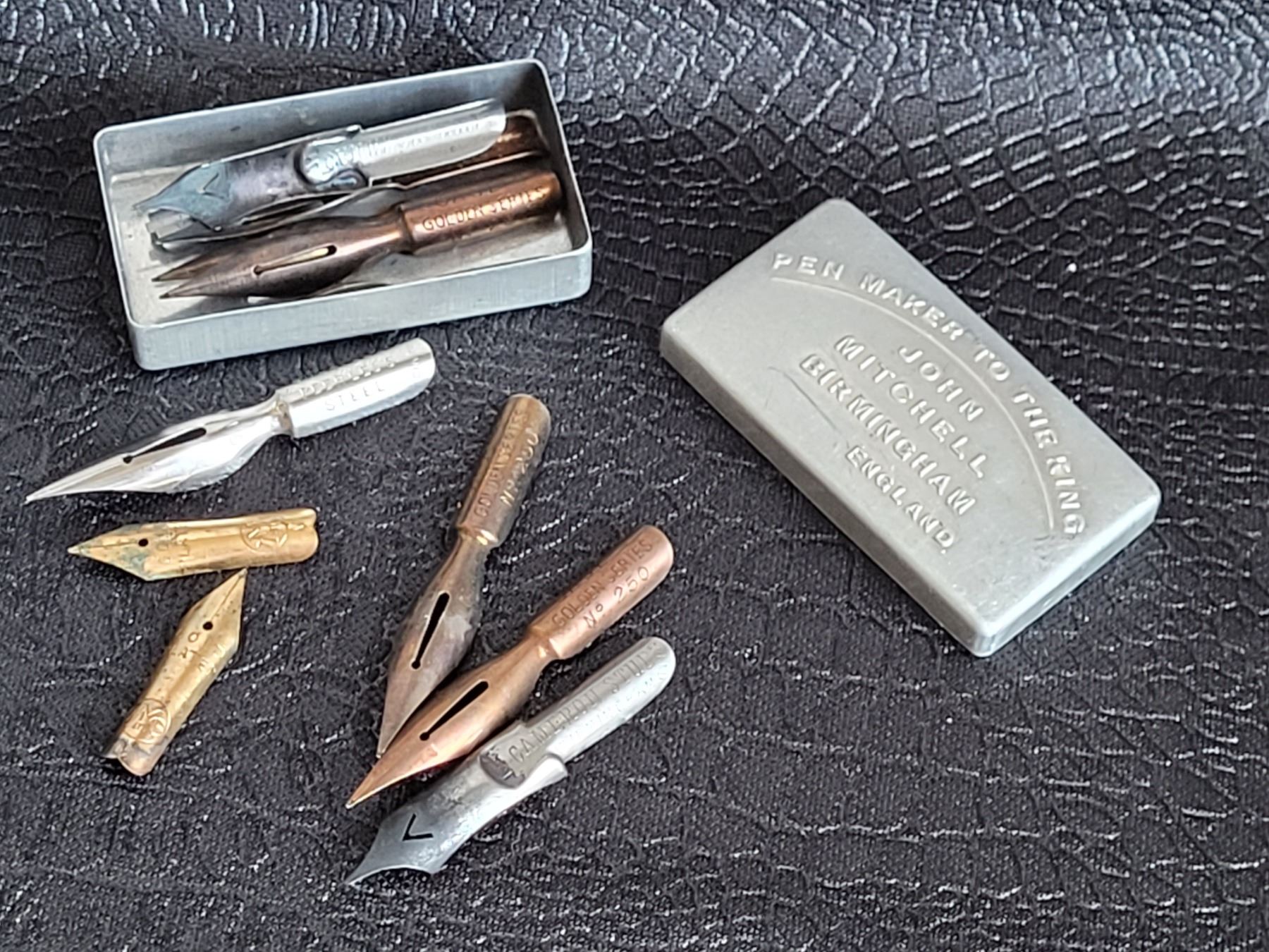 Before the Queen there was the “ Pen Maker to the King” John Mitchell Birmingham England.Small metal box containing pen nibs some Gold plated.