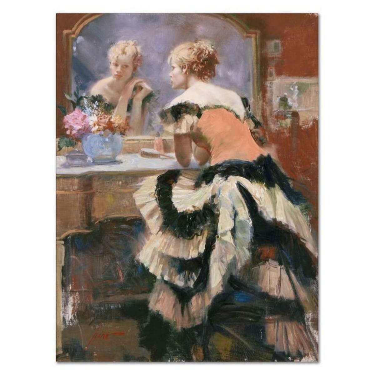 "Before the Show" is a limited edition giclee on stretched canvas that has been hand-embellished by Pino himself, Numbered and Hand signed by Pino (1939-2010). Includes Certificate of Authenticity. Measures approx. 24" x 32" (image).