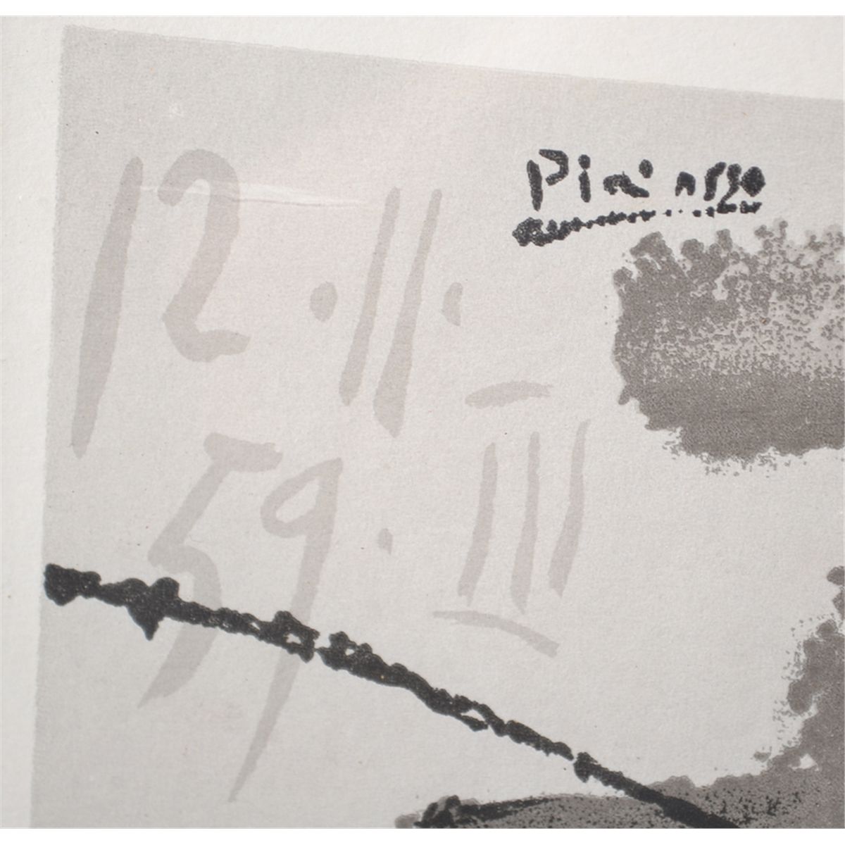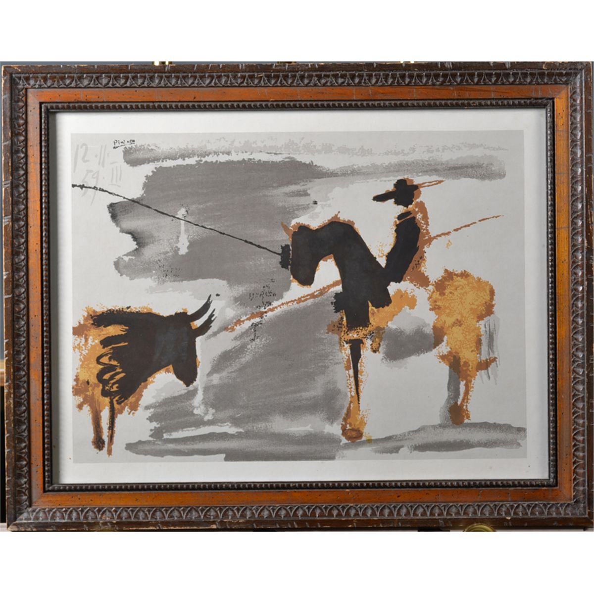 Silkscreen litho in five colors depicting a bullfight scene in Modern stylized fashion. Dated 12-11-59 and signature printed in UR. 16" H x 22" W, sight, 22.5" H x 28.5" W, framed in a two tone brown wood frame and framed behind glass, with Catalda Fine Arts Inc. N.Y. NY label en verso with title. Circa mid 20th century. Private collection Oxford, MI.
