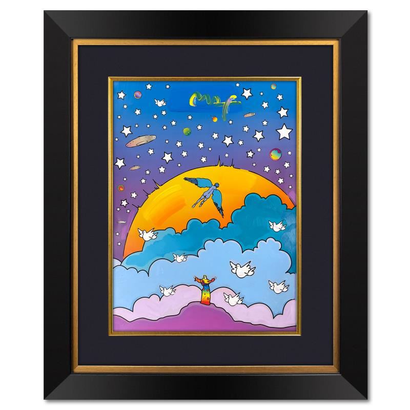 "Beginning of New Age" is a one-of-a-kind acrylic mixed media on paper, hand signed by Peter Max. The piece comes custom framed with a backside cutout to display Peter Max Studio registration number 293930 certifying authenticity. Measures approx. 36" x 30" (frame), 24" x 18" (image).
