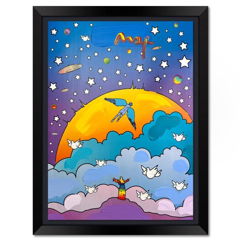 "Beginning of New Age" is a one-of-a-kind mixed media on paper, hand signed by Peter Max. The piece comes custom framed with a backside cutout to display Peter Max Studio registration number 291766 certifying authenticity. Measures approximately 30" x 24" (frame), 24" x 18" (image).