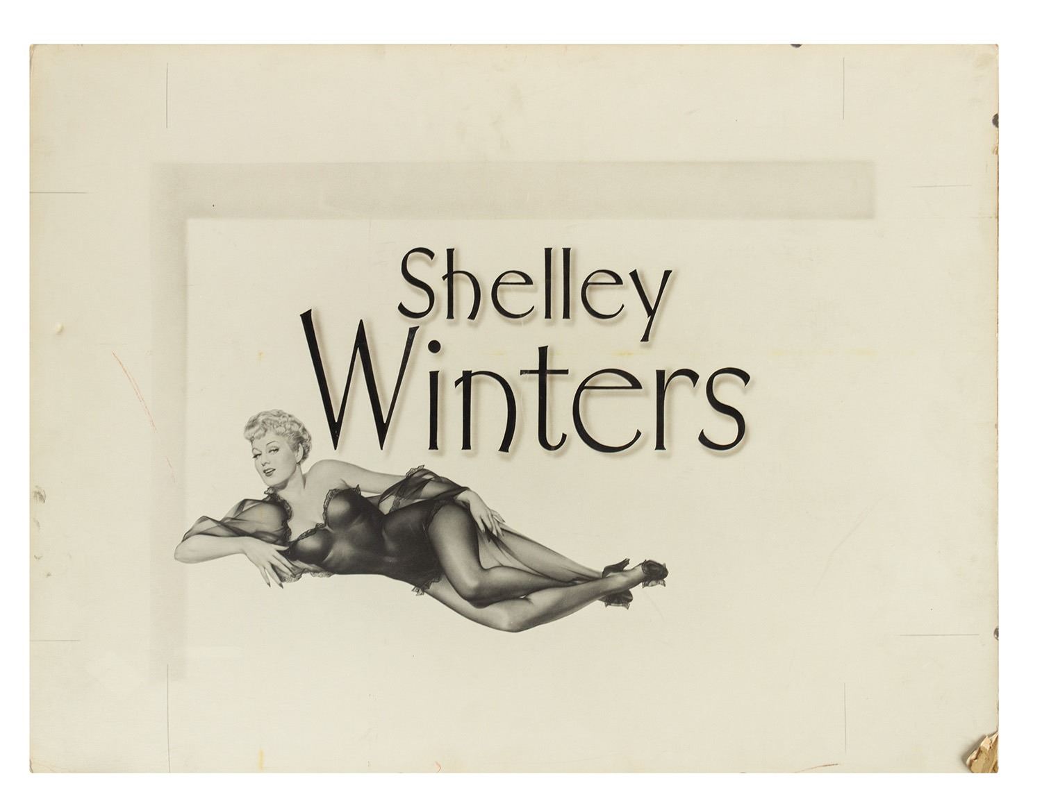 (RKO, 1951) An original title card prop used in the opening of Behave Yourself starring Shelley Winters. At the beginning of the film, several title cards are displayed as lobby cards within the RKO Radio Pictures studio entrance sign. This artwork of Winters is the screen-used prop that introduces Winters in the opening credits. Accomplished in hand-painted lettering over printed artwork of Winters, this prop has several guide-marks at the borders that show how it fit within the studio sign. Measuring 20"x26.5" on art board, the prop is in good overall condition with some scuffs to the surface, and some marks and nicks along the edges.
