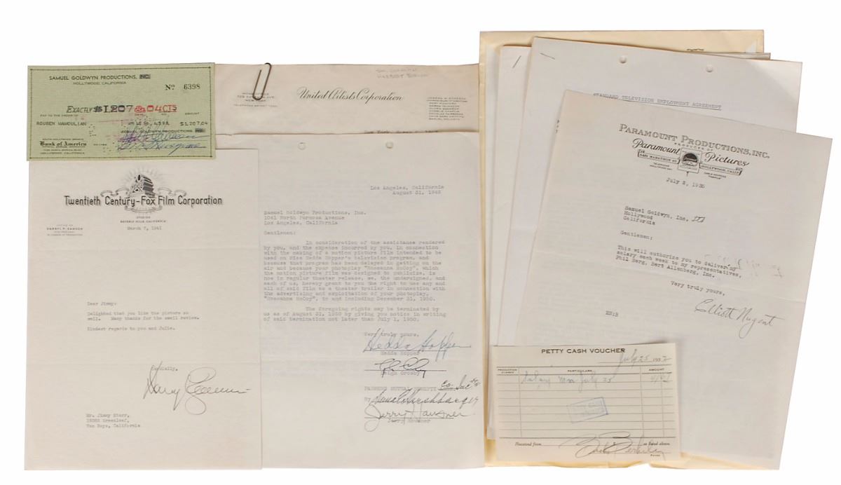 Uncommon collection of nine items, each signed by a notable filmmaker or movie industry pioneer, including: Bill Belew (DS), Busby Berkeley (voucher), Herbert Brenon (DS), Hedda Hopper (DS), Richard Maibaum (DS), Rouben Mamoulian (check), George Masters (DS), Elliott Nugent (TNS), and Darryl F. Zanuck (TLS). In overall fine condition.