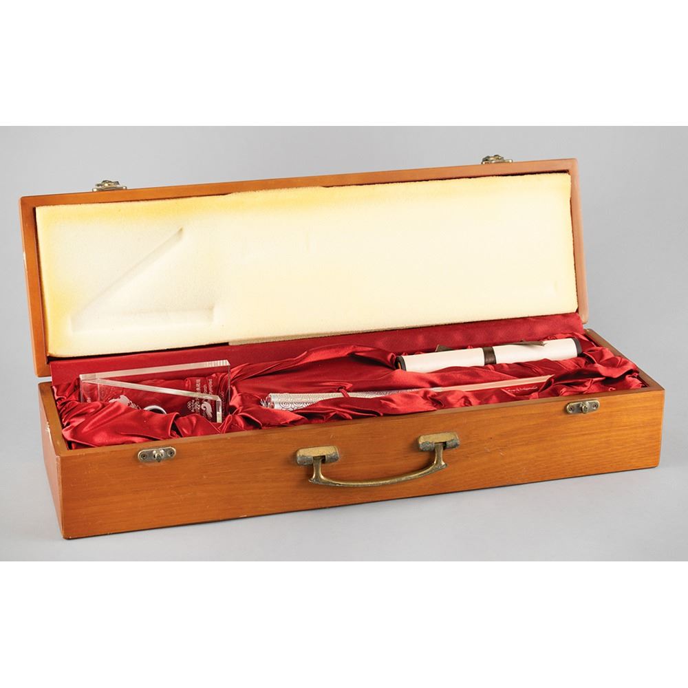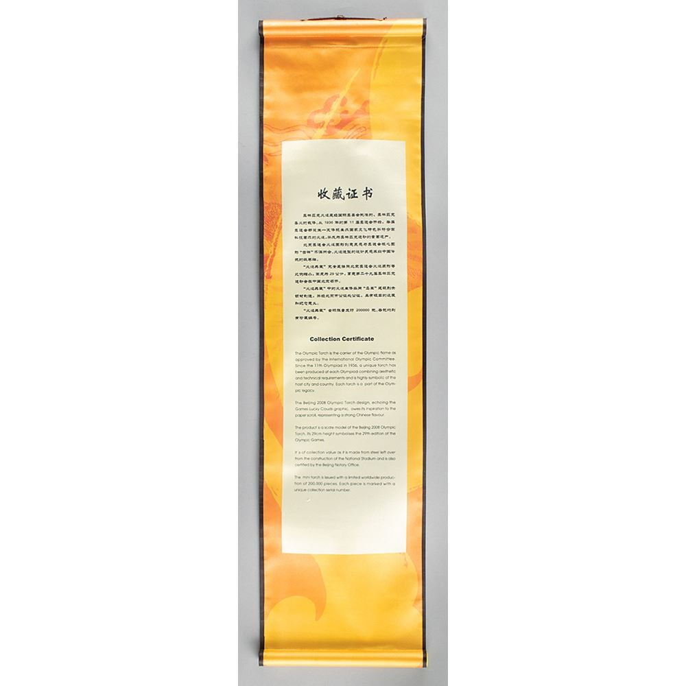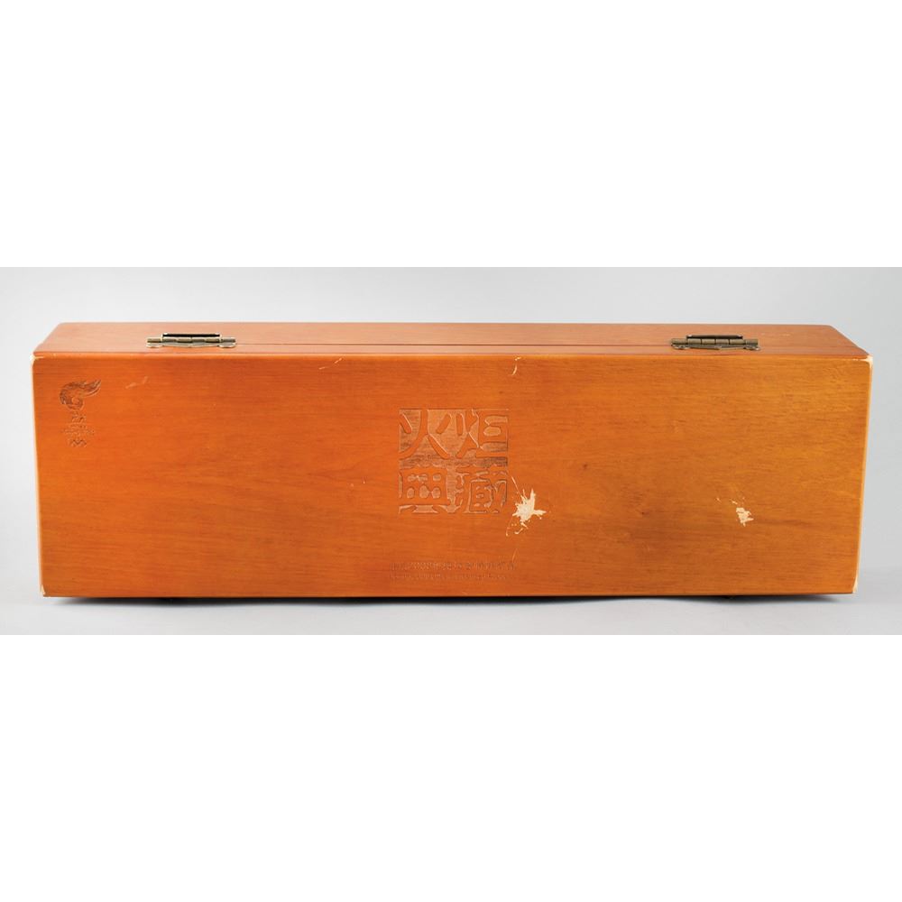 Limited edition miniature replica of the relay torch from the Beijing 2008 Summer Olympics, measuring 11.5Ë long, with a crystal base etched in English and Chinese with the piece's title, "The Classic Edition of the Torch for the Games of the XXIX Olympiad," numbered 071921/200000. Housed in its original wooden case, complete with its commemorative silk scroll. The case has a few scuffs and scratches. The piece, crafted from steel left over from the construction of the Bird's Nest stadium, was released by the Beijing Organizing Committee; its 29 cm length, and original 2,900 yuan price tag, were conceived to represent the 29th modern Olympic Games.