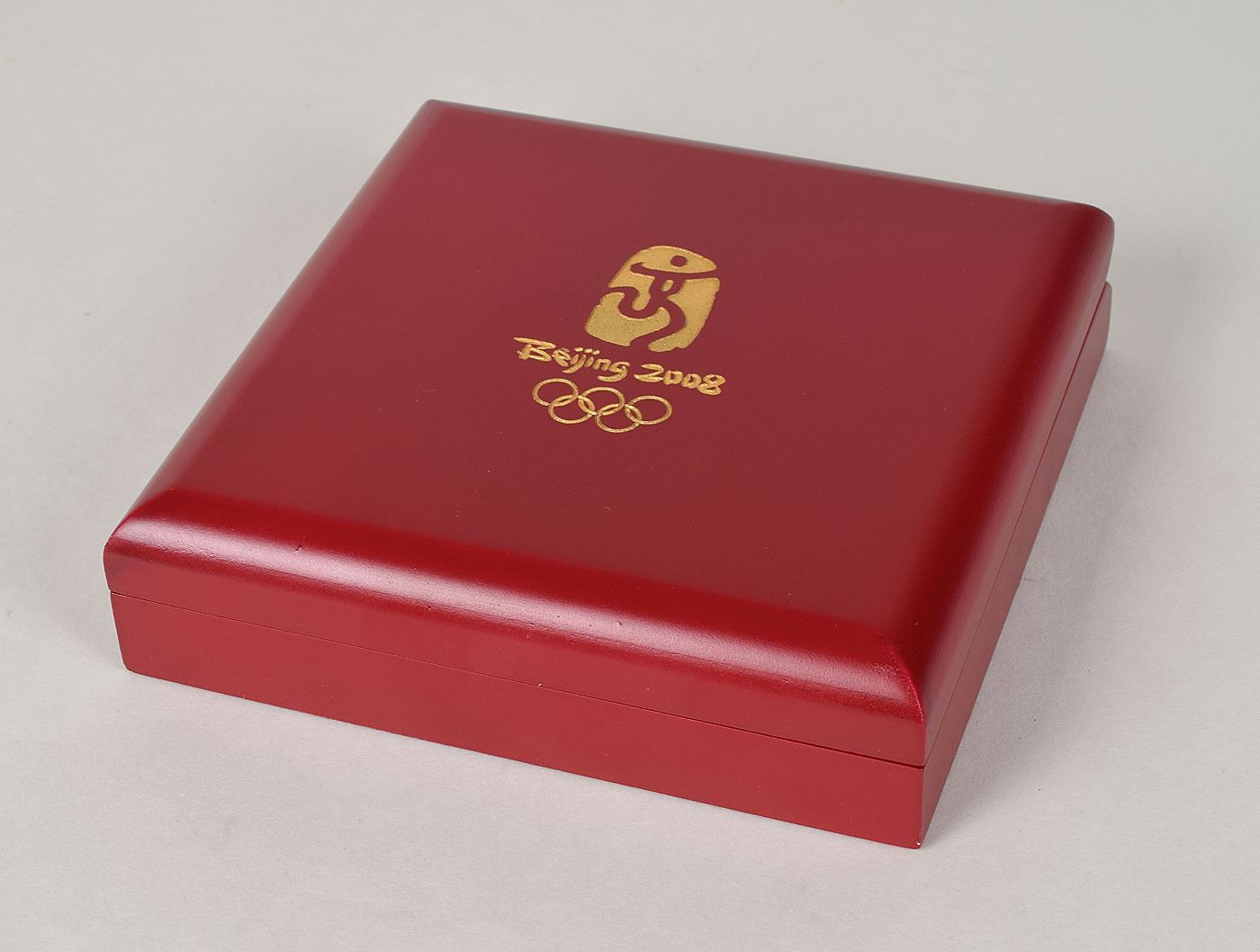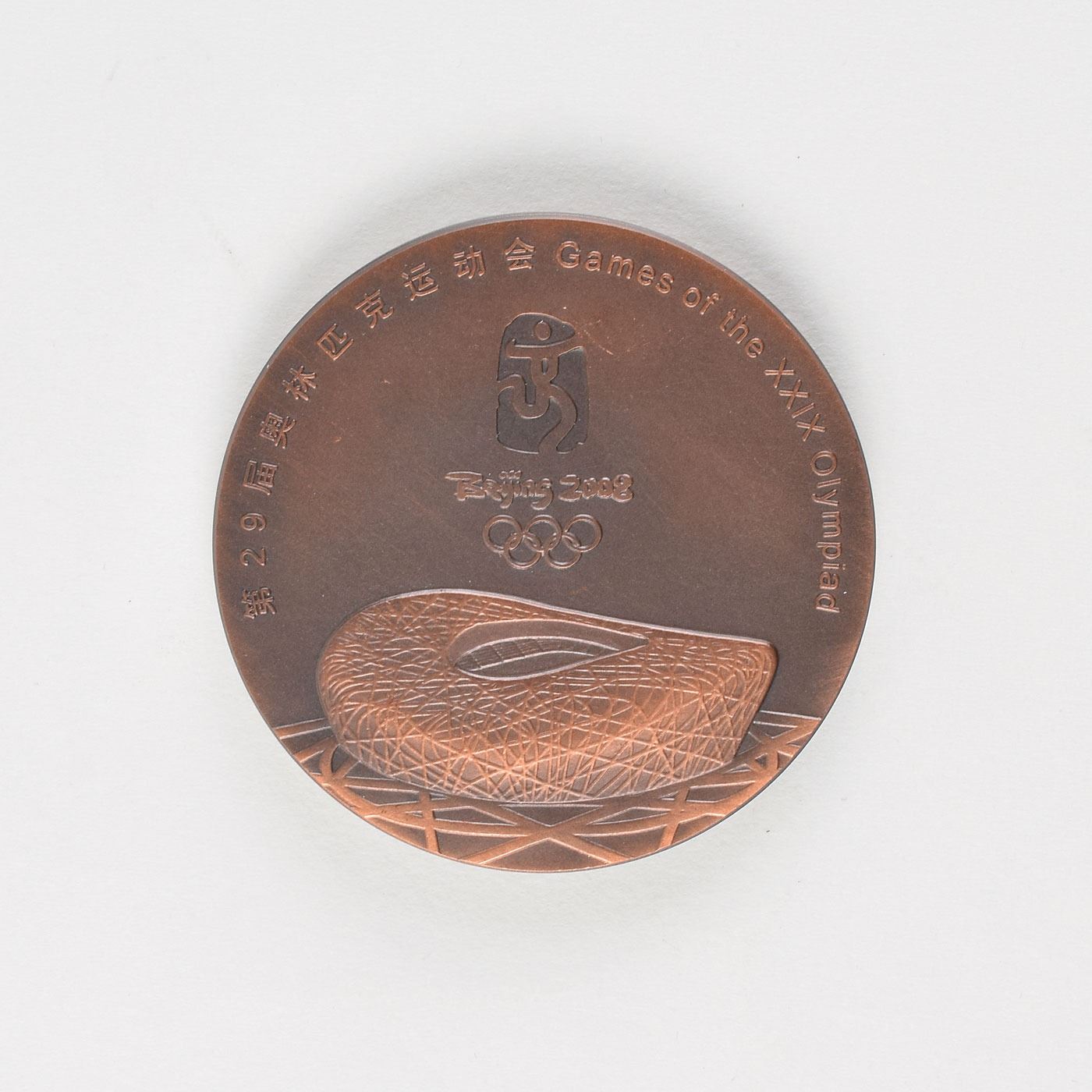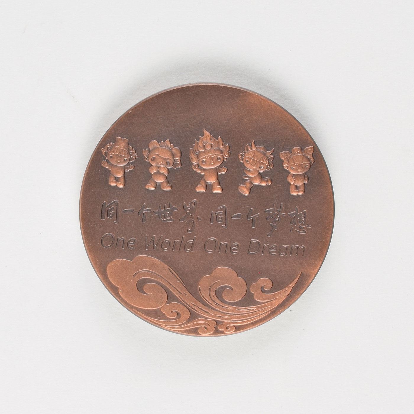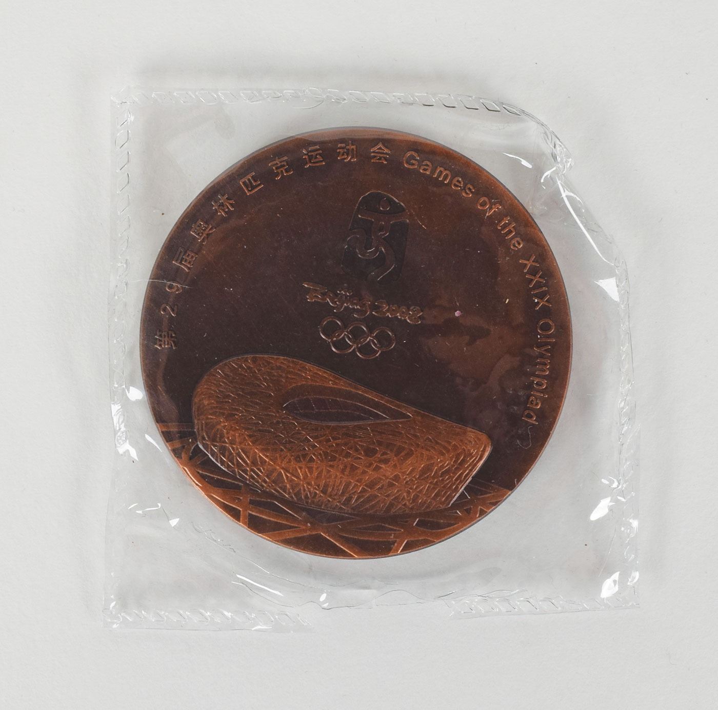 Participation medal issued for the Beijing 2008 Summer Olympics. Bronze, 55 mm, 122 gm. The front features the Beijing Games logo over the Bird’s Nest Olympic stadium, with raised Chinese and English text along the top; the reverse bears five Fuwa mascots over gusts of wind and engraved Chinese and English text, “One World One Dream.” Medal is sealed in its original plastic. Complete with its original red presentation case.