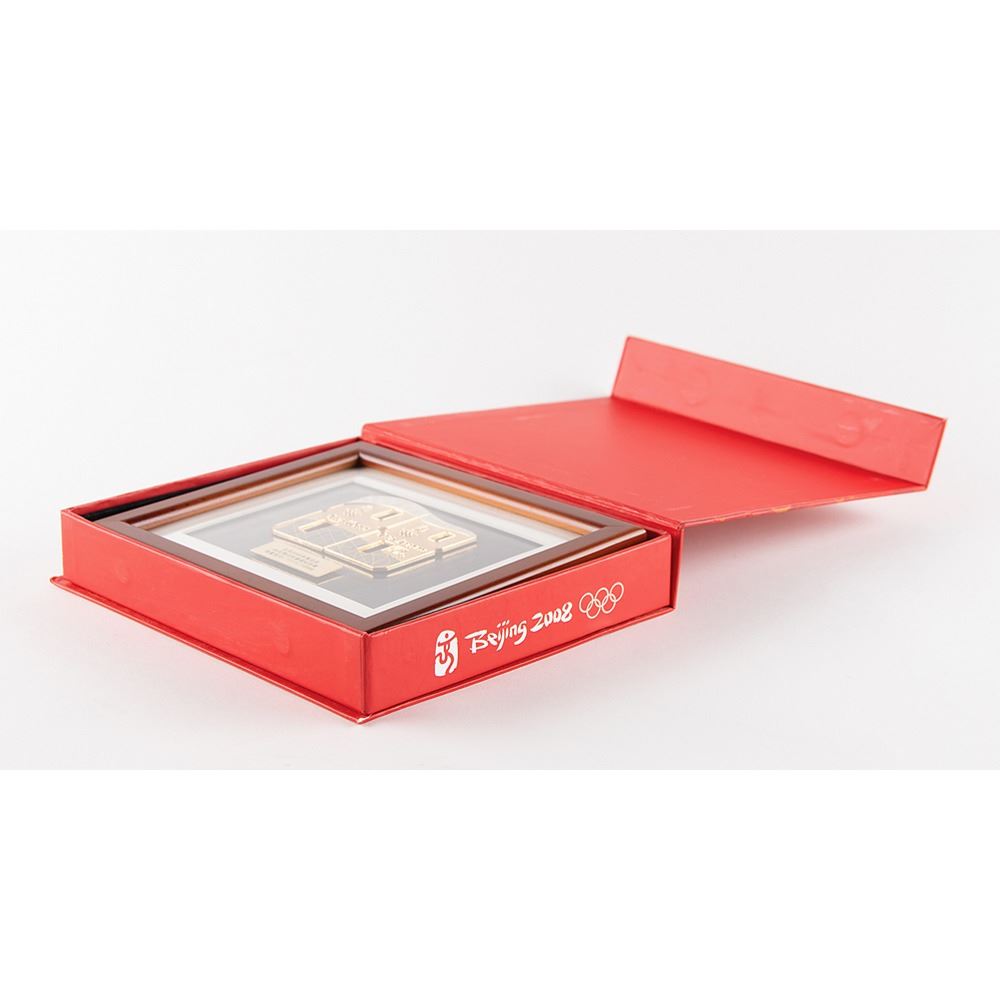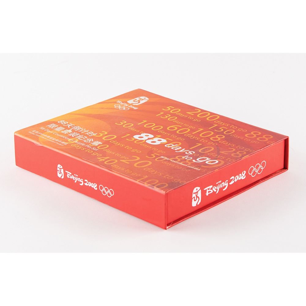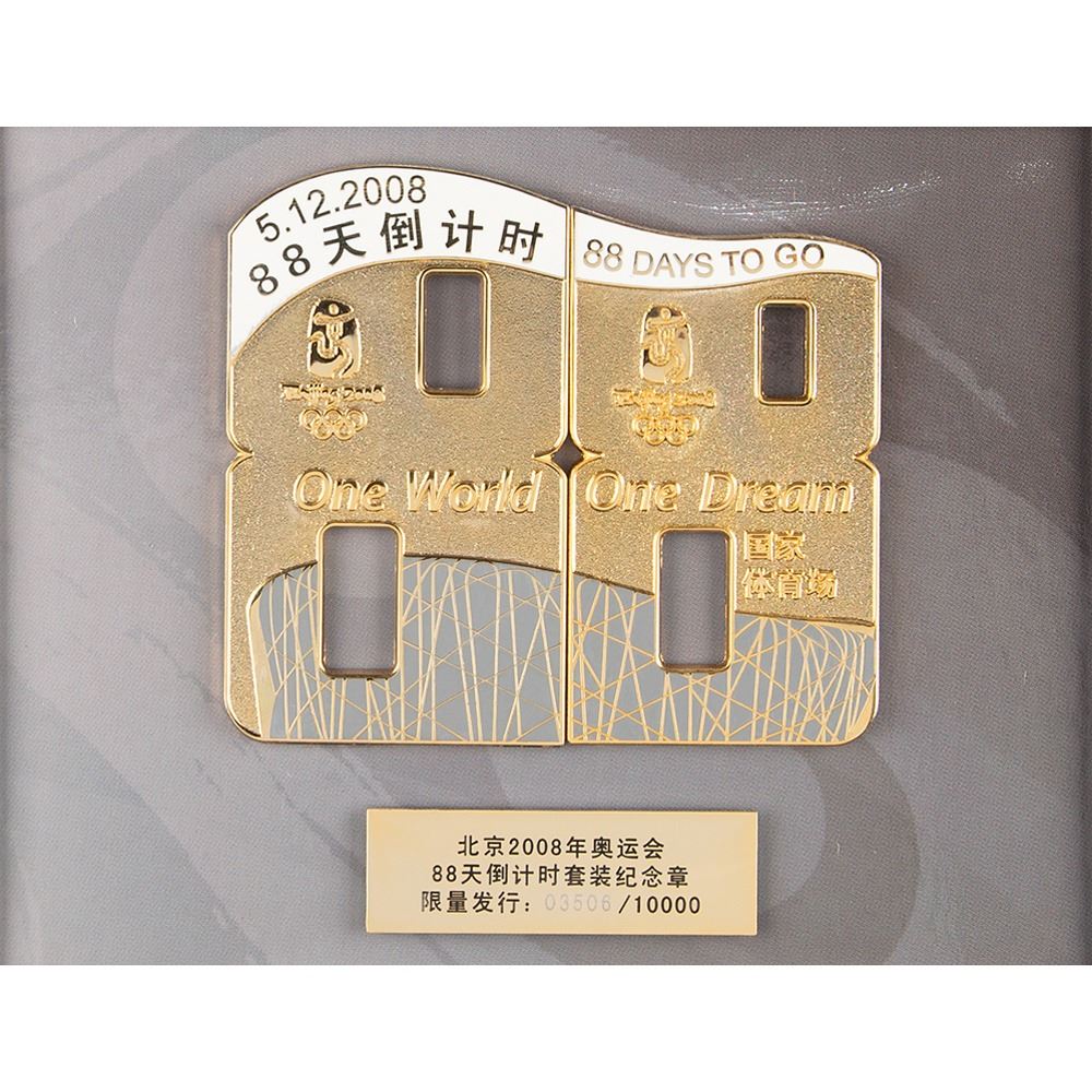 Limited edition ‘88 Days to Go’ gold-tone pin set issued for the Beijing 2008 Summer Olympics, numbered 3506/10000, measuring 3 x 2.75 in the shape of two side-by-side number 8s, which feature English and Chinese text, “5. 12. 2008, 88 Days to Go, One World, One Dream,†a design of Beijing’s Bird's Nest Stadium, and both bearing the 2008 Olympic logo. Mounted in its original frame with edition plate to an overall size of 7.5 x 6.75. Includes the original presentation box for the “88 Days Countdown Puzzle Pin Setâ€; the interior frame holder is now loose due to adhesive loss.
