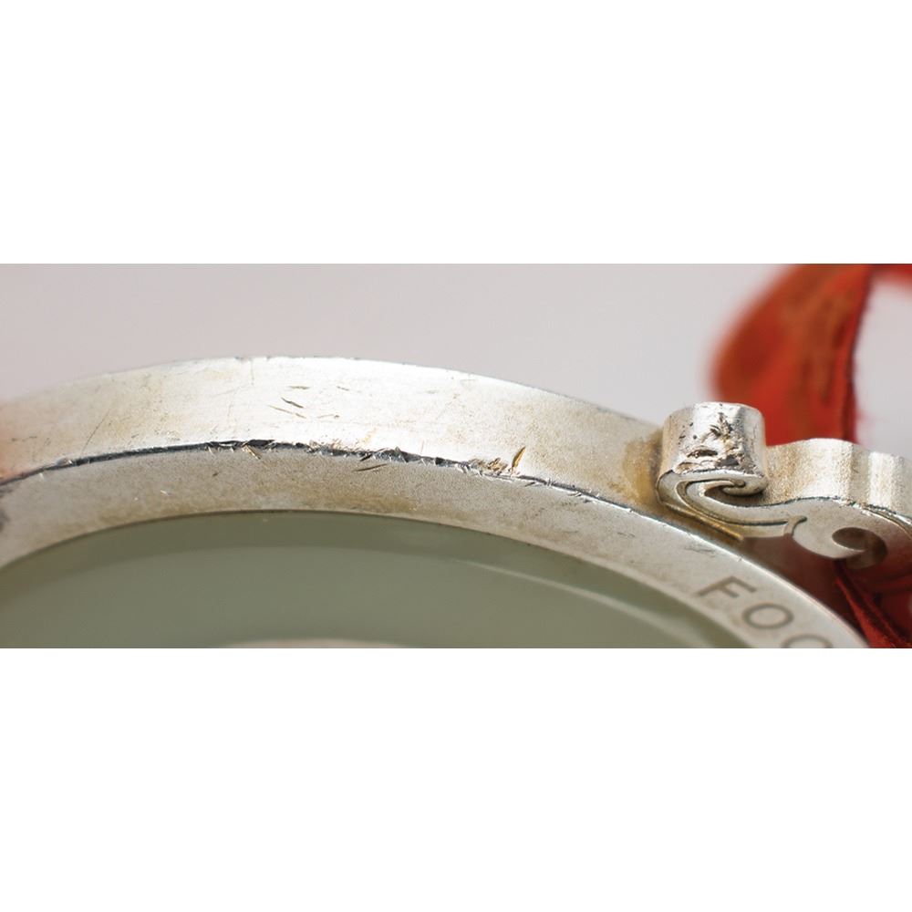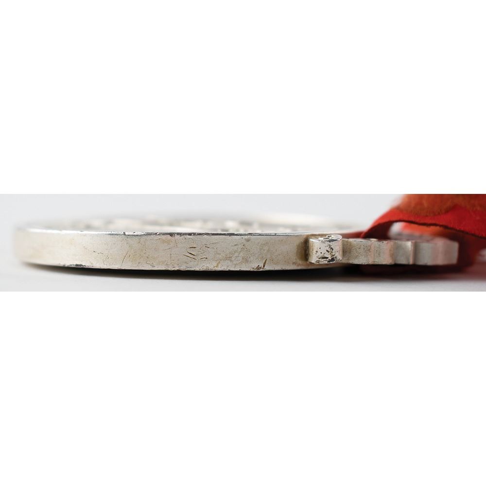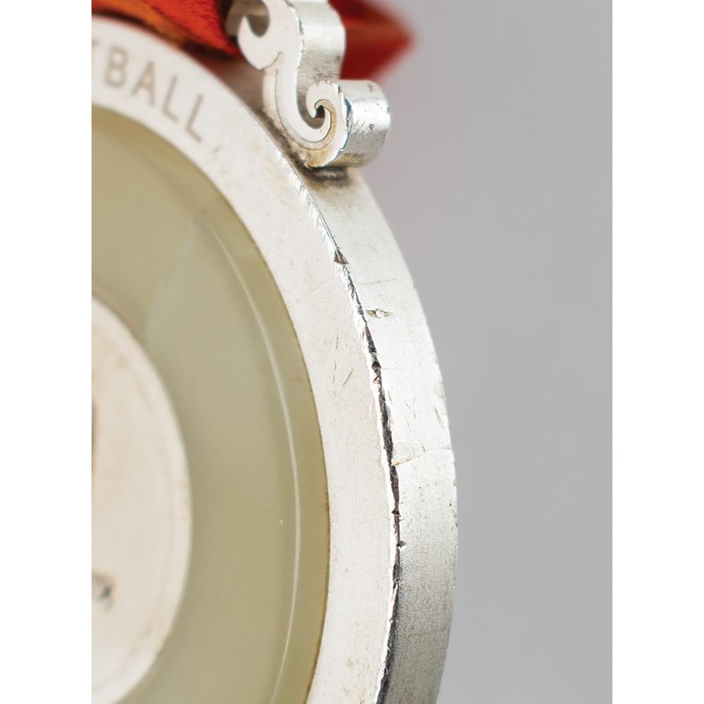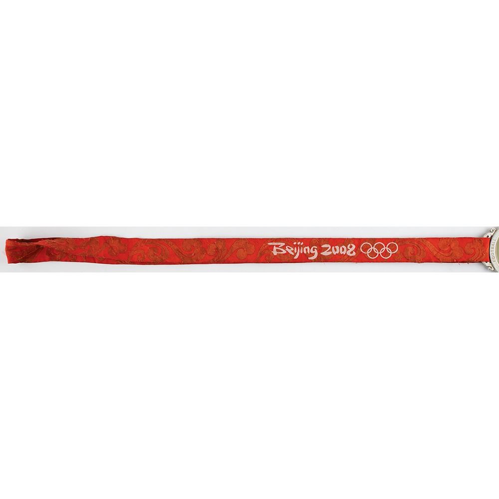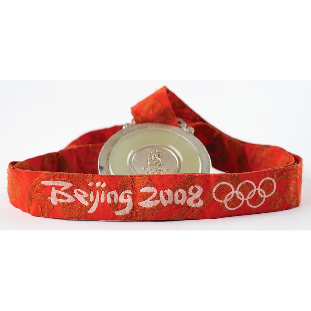 Winner's medal awarded to Nigerian footballer Emmanuel Ekpo at the Beijing 2008 Summer Olympics. Silver with inlaid jade, 70 mm, 186 gm, by Medal Design Group, China Central Academy of Fine Arts, Elena Votsi. Created from ancient Chinese jade patterns, the medal consists of silver and jade, which symbolize nobility and virtue. Jade has been regarded as a virtue since ancient times, and the embodiment of Chinese traditional values of ethics and honor. The front depicts the standing goddess of Victory against panoramic imagery of the Panathinaikos Arena, with text above reading: "XXIX Olympiad Beijing 2008"; and the reverse features the Beijing Games emblem surrounded by inlaid jade and the outer circle engraved with the sport, "Football, Men." The design inspiration of the medal hook derives from jade 'huang,' a ceremonial jade piece decorated with a double dragon pattern and 'Pu,' the reed mat pattern. The medal bears some instances of scuffing, discoloration, and some scattered abrasions to rim and edge. Includes the original well-worn red-and-orange ribbon. Accompanied by a signed letter of provenance from Ekpo.