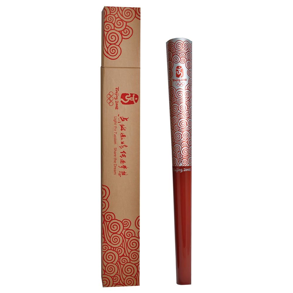 Unused official 2008 Beijing Summer Olympics torch, constructed of anodized aluminum and rubber, measuring 28.5″ in length and 3″ at its widest point, designed by Lenovo China and Aerospace Science & Industry, and manufactured by Zhongshan Vatti Gas Appliance Stock Co., Ltd. The curved shape of the torch embodies that of both a parchment scroll and a cloud, the latter an ancient decorative element from Chinese art which is found on buildings, sculptures, and furniture. The upper portion of the torch is covered in etched patterns of 'propitious clouds' and bears the Beijing logo and Olympic rings; its red color symbolizes the spirit of celebration, enthusiasm, and good fortune. The lower handle portion is inscribed "Beijing 2008," and is layered with a fine rubber-based varnish, a finish specifically designed to improve grip and replicate the contact of human skin as if the torchbearer were holding a friend's hand. Includes its original Olympic box. The Olympic flame of the 2008 Olympics was lit on March 24, and was carried across the globe by a total of 21,800 torchbearers. Over the course of 130 days, the flame traversed over 85,000 miles, passing through every continent sans Antarctica, and even made its way to the summit of Mount Everest in a specially designed safety lamp.