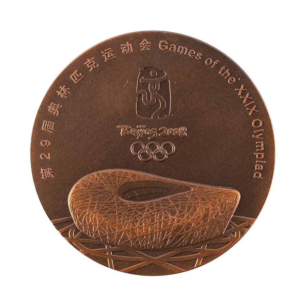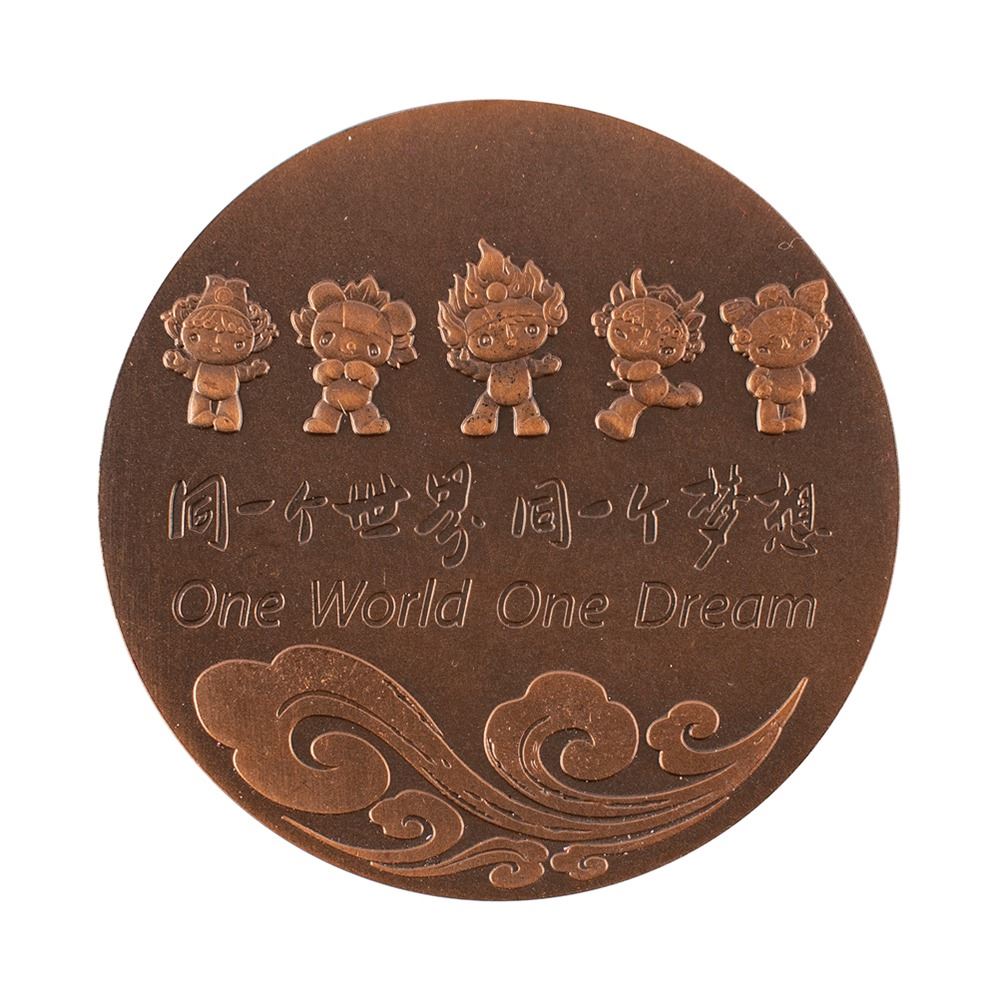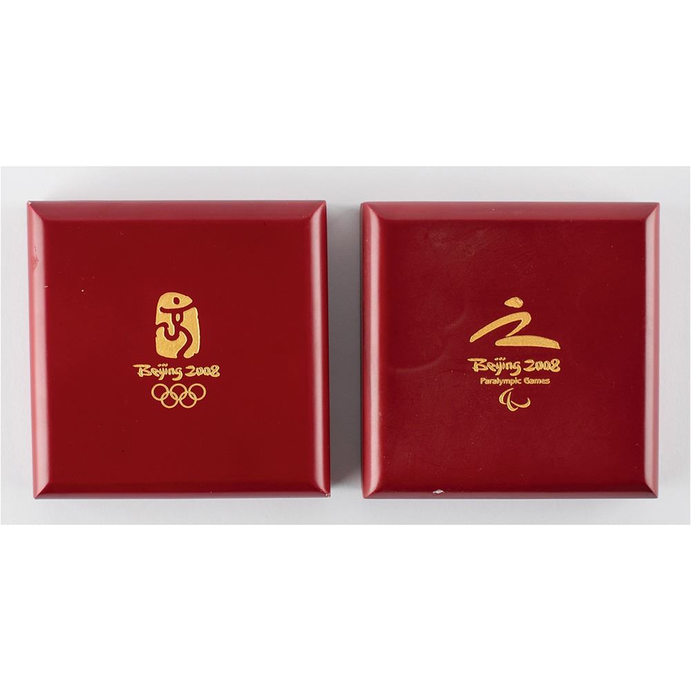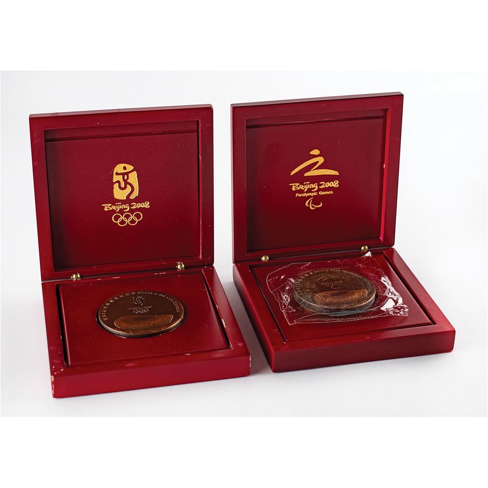 Appealing pair of participation medals issued for the Beijing 2008 Summer Olympics and Paralympics. Both medals are bronze, 55 mm, 122 gm, with the fronts featuring the Bird’s Nest Olympic stadium, their respective Games logo, and raised Chinese and English text along the top; and the reverse sides depict gusts of wind and engraved Chinese and English text, “One World One Dream,†with the Olympics medal showing five Fuwa mascots, and the Paralympic medal showing the cow Fu Niu Lele. Both medals include their original red presentation case, which bear a few scuffs. The Paralympic medal is sealed in a plastic pouch.