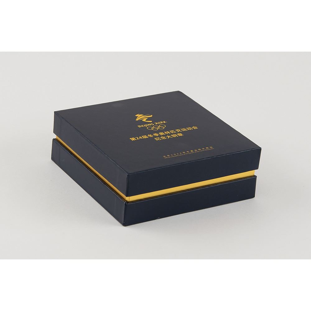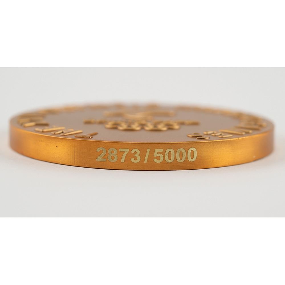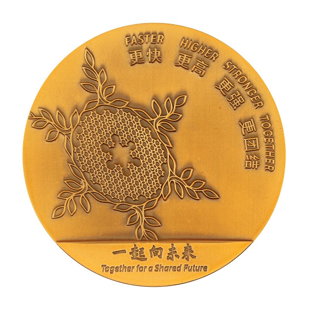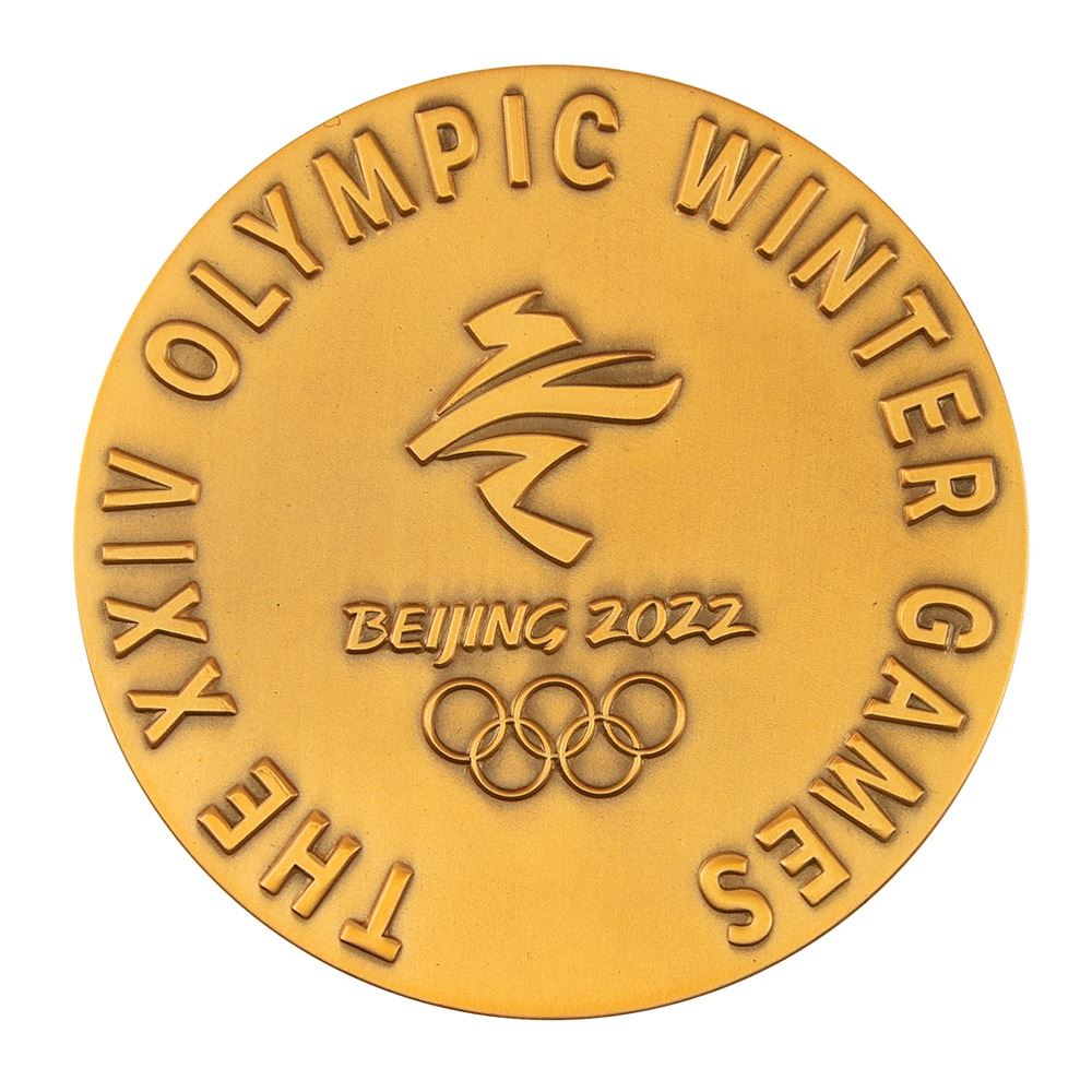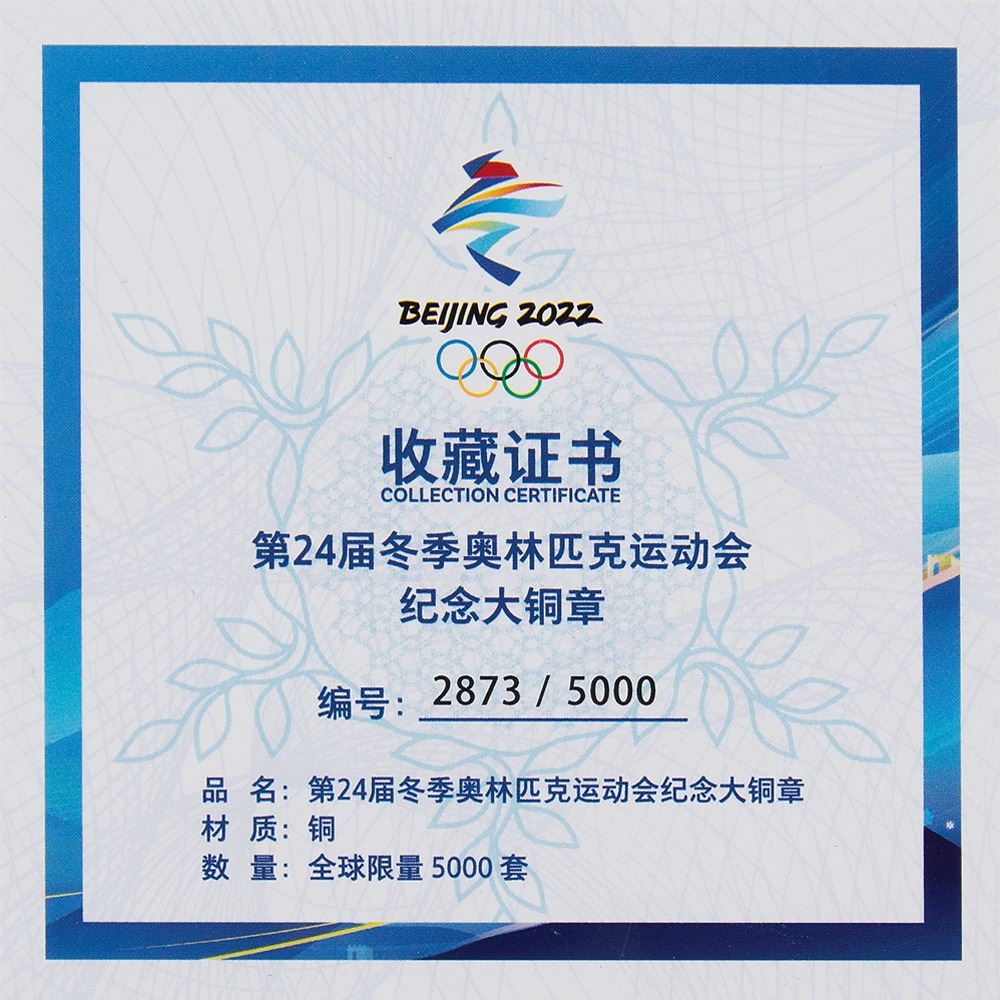 Limited edition souvenir medal from the Beijing 2022 Winter Olympics, designed in the manner of participation medals from Olympics past. The front of the gold-tone medal, 75 mm, 225 gm, features the Beijing Games logo encircled with raised text, “The XXIV Olympic Winter Games,†and the reverse shows the ‘snowflake’ design with six olive branches, and raised English and Chinese text, “Faster, Higher, Stronger, Together,†with the Beijing Olympics motto: “Together for a Shared Future.†The edge bears the edition number: 2873/5000. Includes its presentation box with slipcase and certificate.
