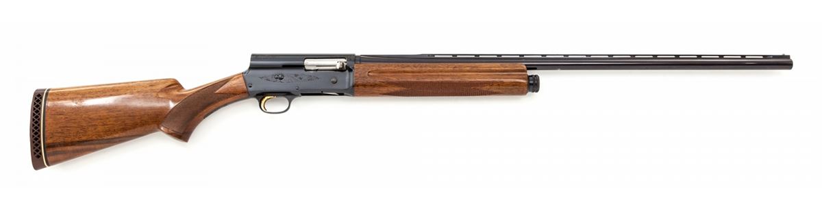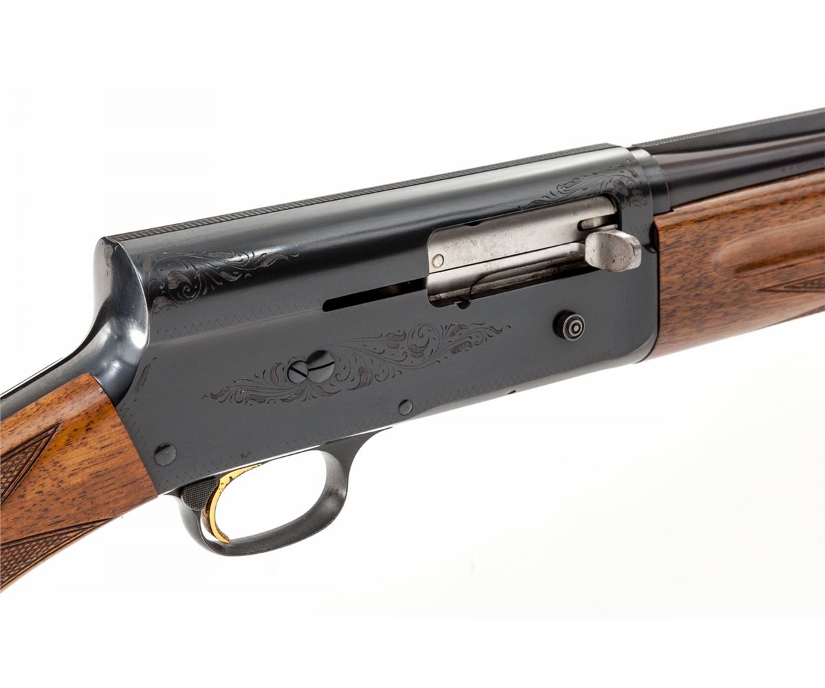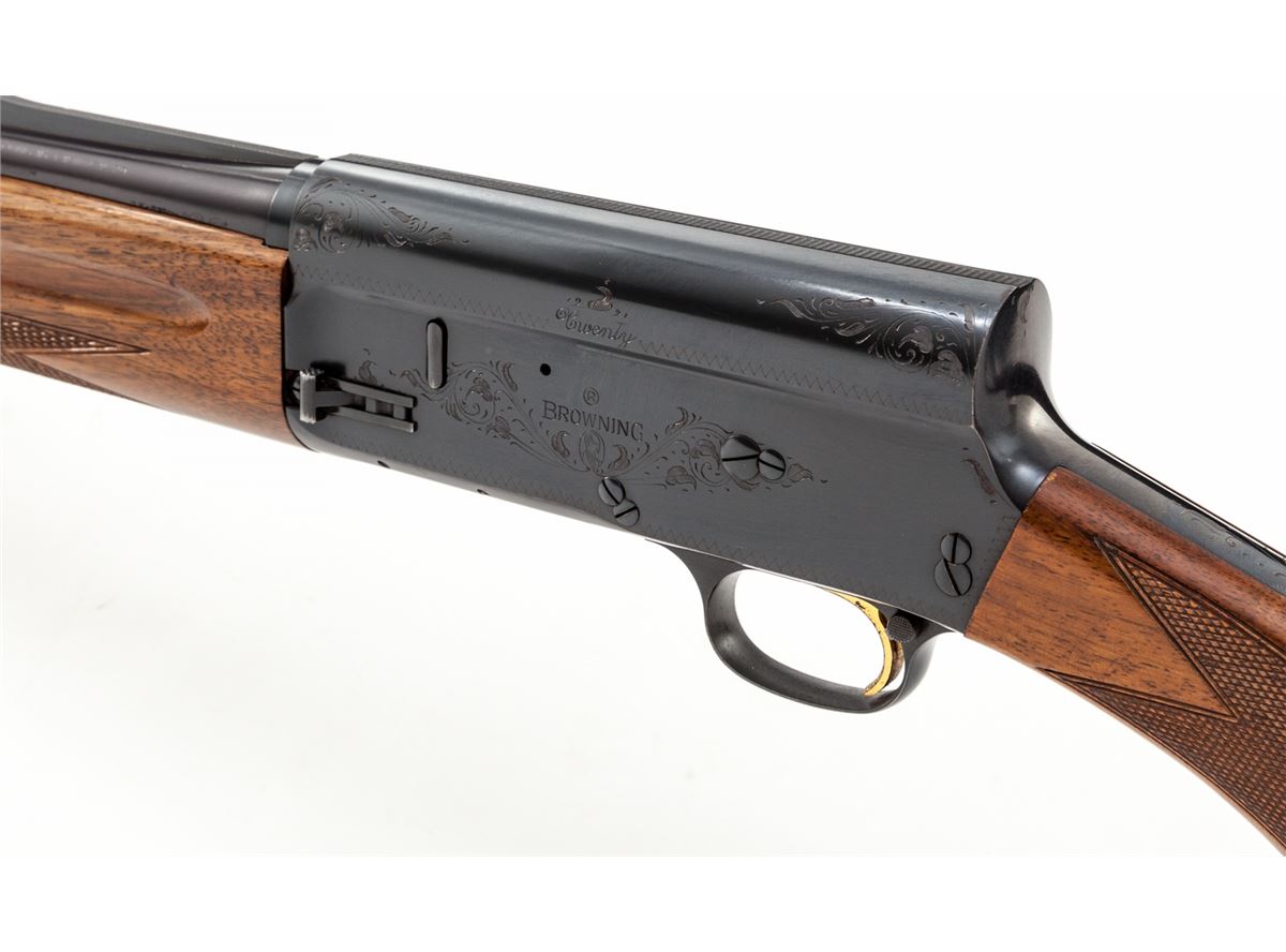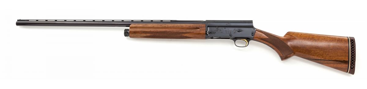 Belgian Browning Auto-5 Semi-Automatic Shotgun, #68Z33596, 20 ga., 27'' vent rib barrel choked Mod. for 2-3/4'' shells, blue finish, factory checkered pistol-grip European walnut stock and forend, with Whiteline brown rubber butt pad. Condition is near excellent retaining approx. 97% original blue; barrel is somewhat plum in color. Checkering is crisp with light impressions to wood. Gold trigger with considerable losses to plating at face. Very light corrosion at lower tang area. Crisp action, bright bore. Est.: $500-$750. (Modern)