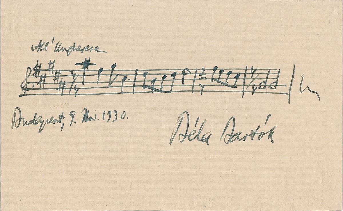 Bold AMQS on an off-white 6.5 x 4 album page, signed below by Bartok and dated at Budapest, November 9, 1930. Bartok pens four bars, probably from ‘Nine Little Pieces for Piano Solo,’ labeled “All'Ungherese [in the Hungarian style].” In very fine condition.