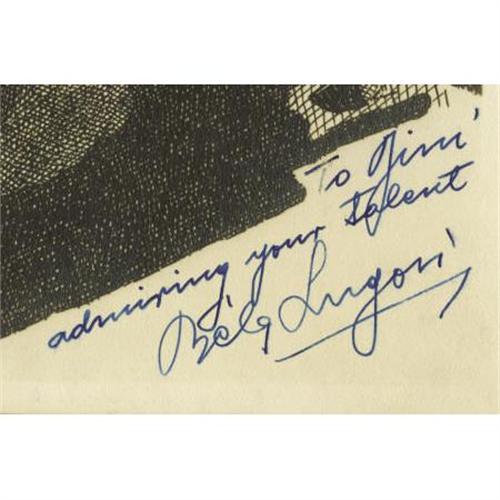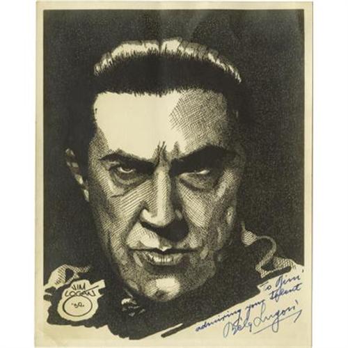 <B>Bela Lugosi Signed "Dracula" Print.</B></I> Bela Lugosi's performance as Dracula in the 1932 eponymous horror classic defined his career and also resulted in constant typecasting. Still, he loved the role so much he arranged to be buried in one of his costume capes. This vintage 8" x 10" print of a sketch of Lugosi as Dracula, drawn by Jim Logan circa 1939, is inscribed and signed by Lugosi in blue ink and in Fine to Very Fine condition with mild overall tanning and wear, and a large crease to the lower left corner. <I>From the Jim Logan Collection.</B></I> <I>Accompanied by LOA from PSA/DNA.</B></I><BR><BR><b>Shipping:</b> Flat Material, Small (<a target="_blank" href="http://www.heritageauctions.com/common/shipping.php">view shipping information</a>)