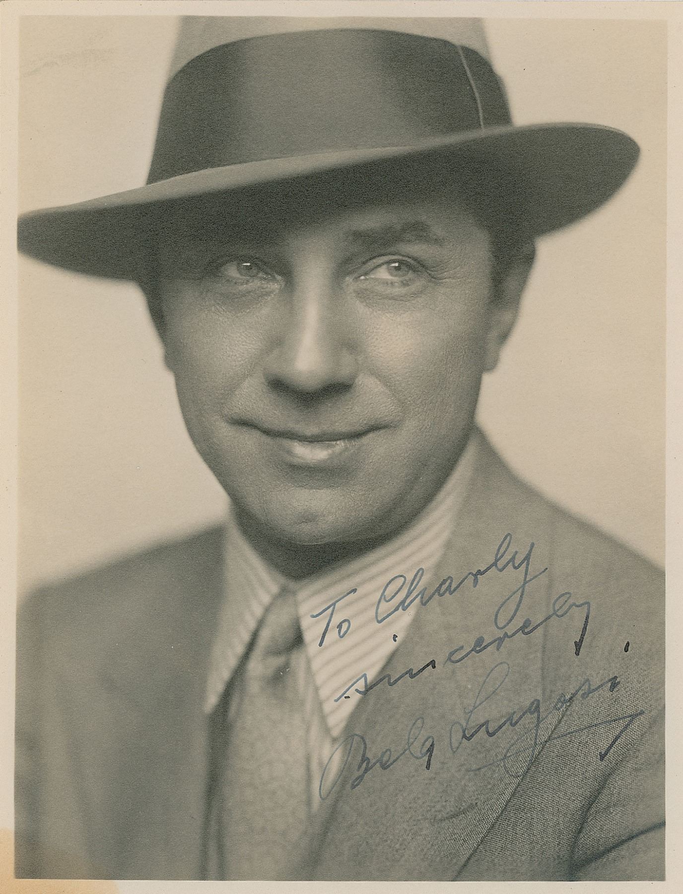 Fantastic vintage matte-finish 6.5 x 8.5 photo of Lugosi wearing a fedora in a handsome up-close pose, signed and inscribed in fountain pen, "To Charly, sincerely, Bela Lugosi.” In very fine condition.