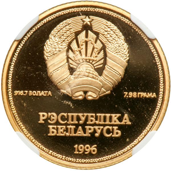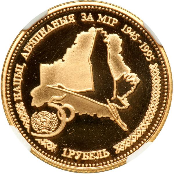 Belarus. Rouble, 1996. Fr-2a; KM-31. Weight 0.2352 ounce. United Nations 50th Anniversary. National arms. Reverse: Map of Belarus and UN logo. NGC graded Proof 69 Ultra Cameo.