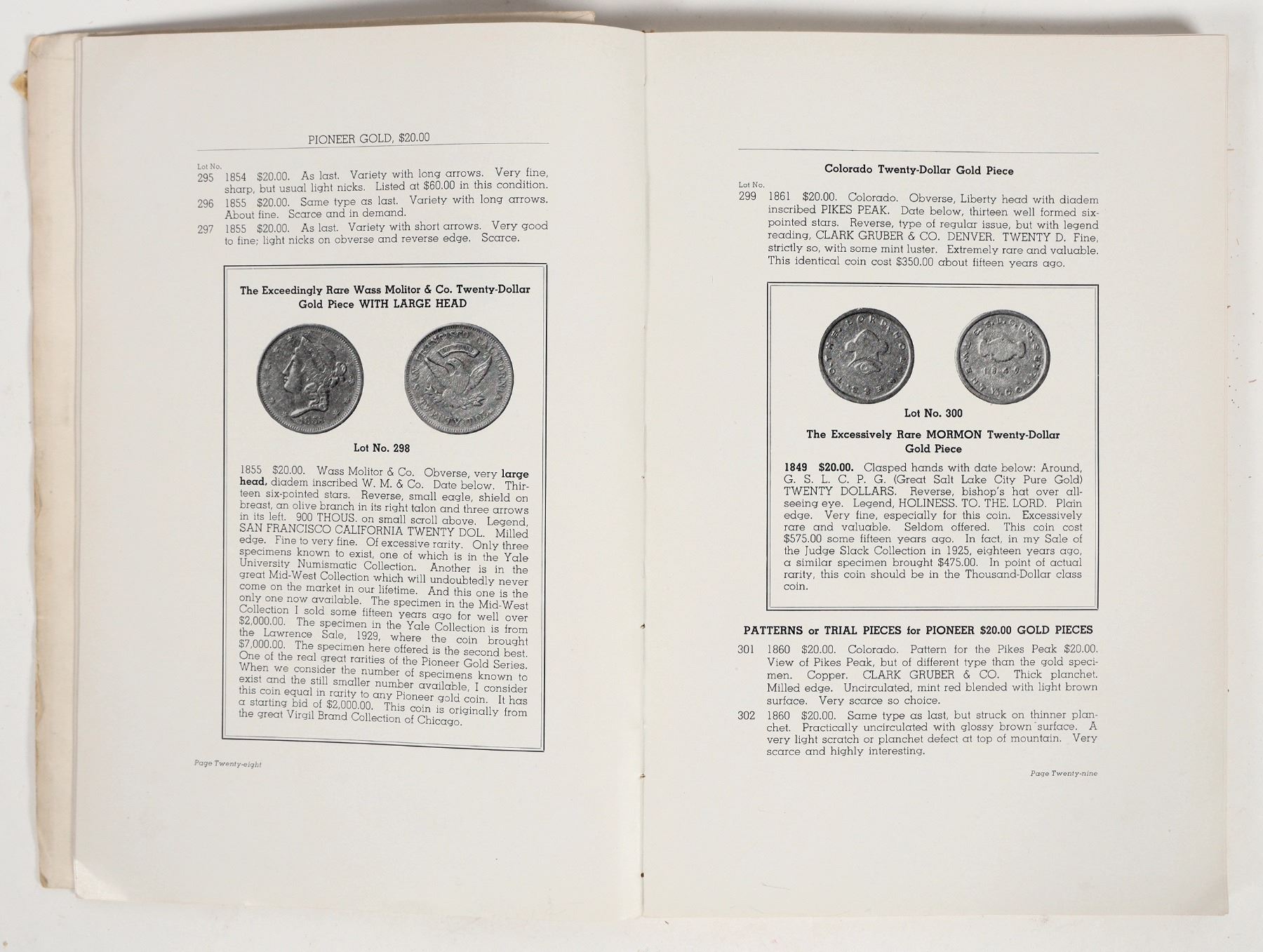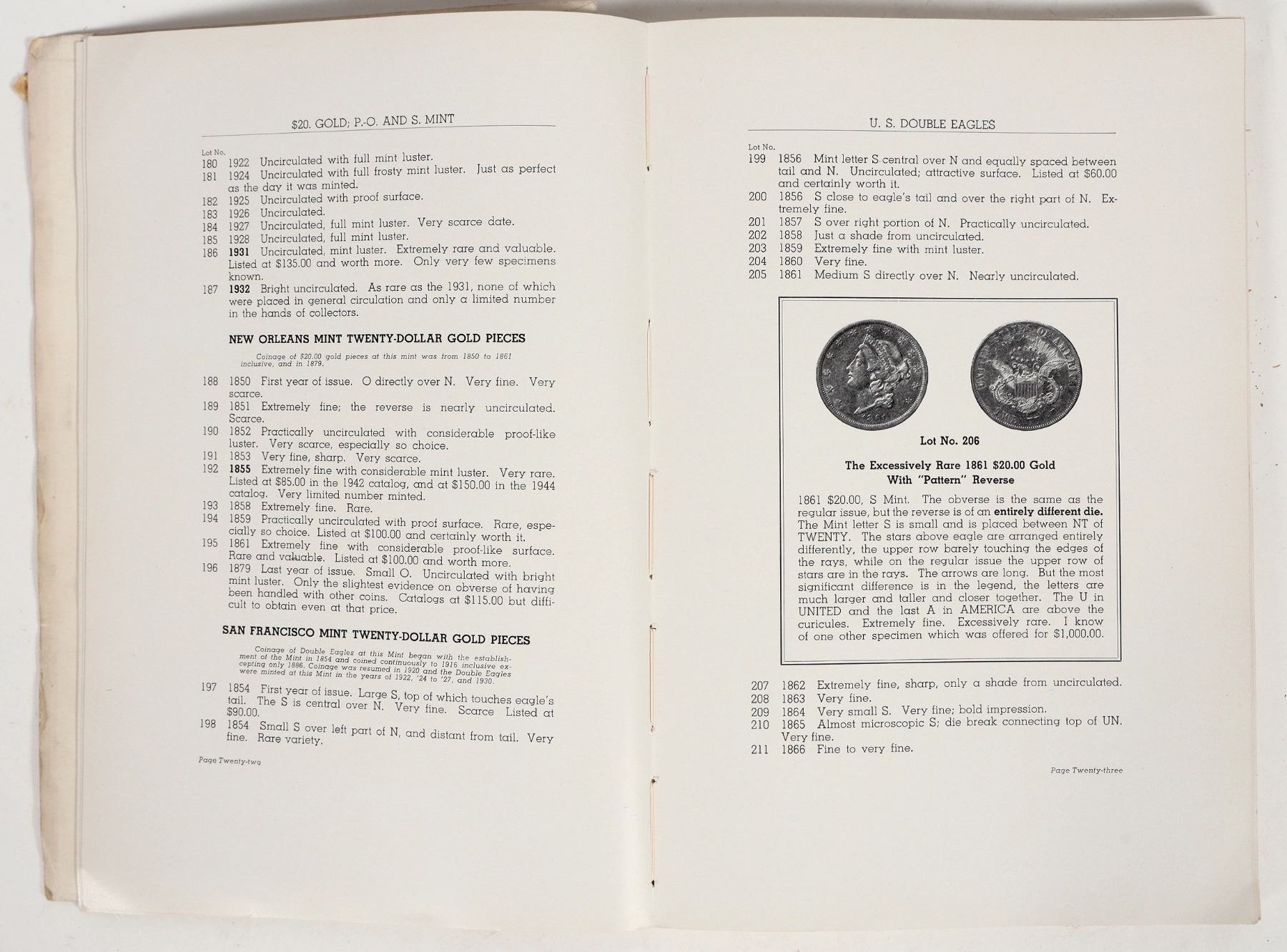 231 page catalog of exceptional and important numismatic sale featuring fine early us coins, pioneer gold coins, and others ever offered through WWII. it is quoted by numerous numismatic authors for exceptional rarity of the coins offered. prices realized included.