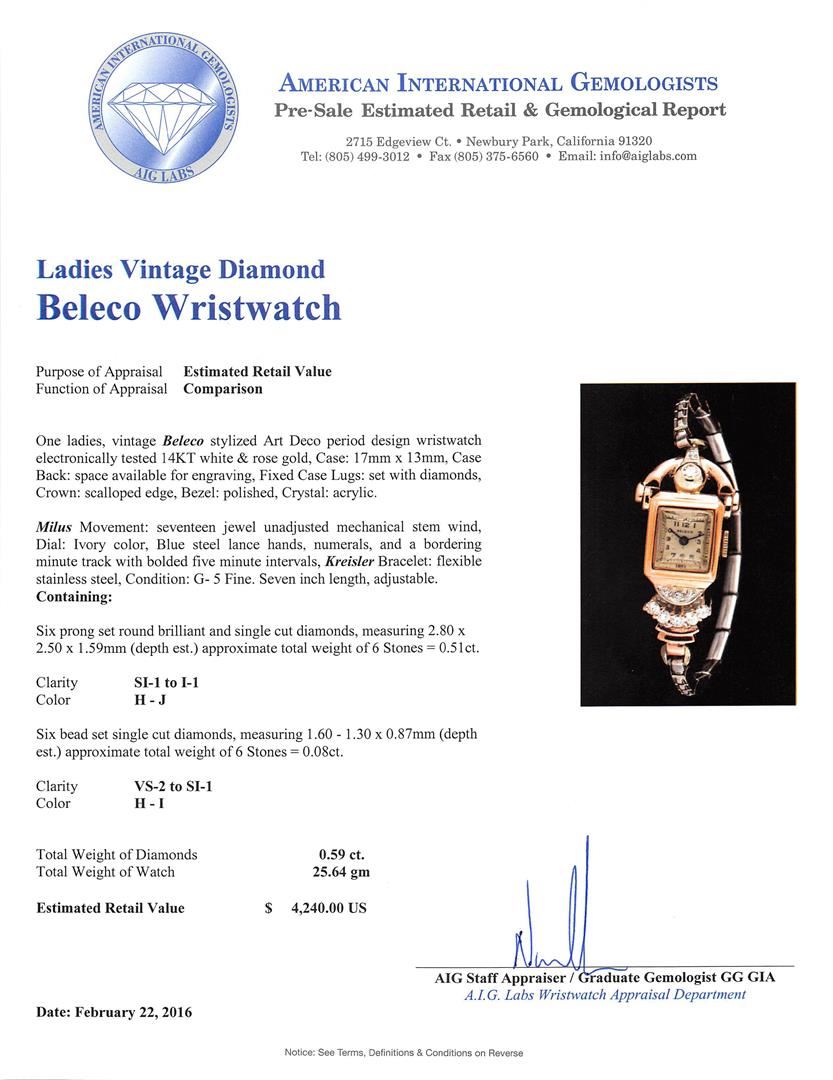 One ladies, vintage Beleco stylized Art Deco period design wristwatch electronically tested 14KT white & rose gold, Case: 17mm x 13mm, Case Back: space available for engraving, Fixed Case Lugs: set with diamonds, Crown: scalloped edge, Bezel: polished, Crystal: acrylic. Milus Movement: seventeen jewel unadjusted mechanical stem wind, Dial: Ivory color, Blue steel lance hands, numerals, and a bordering minute track with bolded five minute intervals, Kreisler Bracelet: flexible stainless steel, Condition: G- 5 Fine. Seven inch length, adjustable. Containing: Six prong set round brilliant and single cut diamonds, measuring 2.80 x 2.50 x 1.59mm (depth est.) approximate total weight of 6 Stones = 0.51ct. Clarity: SI-1 to I-1. Color: H - J Six bead set single cut diamonds, measuring 1.60 - 1.30 x 0.87mm (depth est.) approximate total weight of 6 Stones = 0.08ct. Clarity: VS-2 to SI-1. Color: H - I. Total Weight of Diamonds 0.59ct. Total Weight of Watch 25.64gm. AIG Appraised at $4,240.00.
