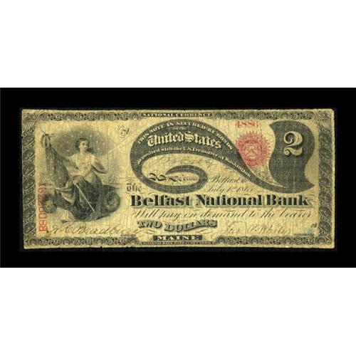 <B>Belfast, ME</B></I> - $2 Original Fr. 387 <B>The Belfast NB</B></I> Ch. # 840<BR> This well circulated example is new to the Kelly census and makes it first appearance with us here. Lazy Deuces at public sale are not a common occurrence for this issuer. Some pinholes and the usual margin issues are seen though the pen signatures have stood the test of time. <B>Good-Very Good</B></I>.<BR><BR><b>Shipping:</b> Coins & Currency (<a target="_blank" href="http://www.heritageauctions.com/common/shipping.php">view shipping information</a>)