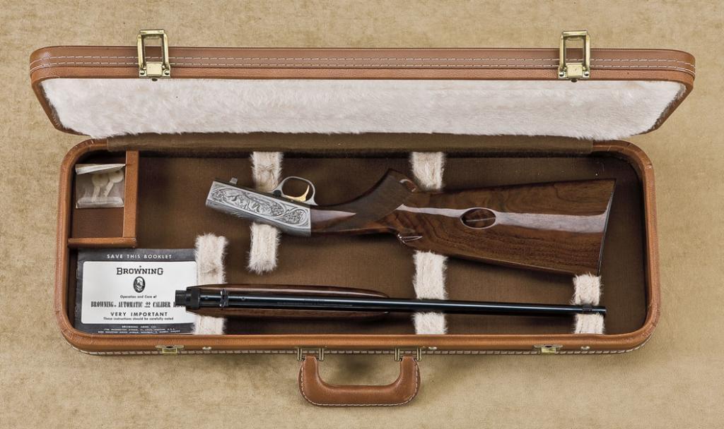 Belgian Browning .22 caliber semi-automatic rifle, grade II, blue and satin finish, select checkered wood stocks in luggage case, serial number “62972”. The rifle remains in near fine original condition with 98-99% original blue on barrel, some slight evidence of use and firing, frame shows some minor oxidation. Stocks are near excellent and show good grain to the burl wood. In Browning luggage case with instructions. Est.: $1,250-$2,500