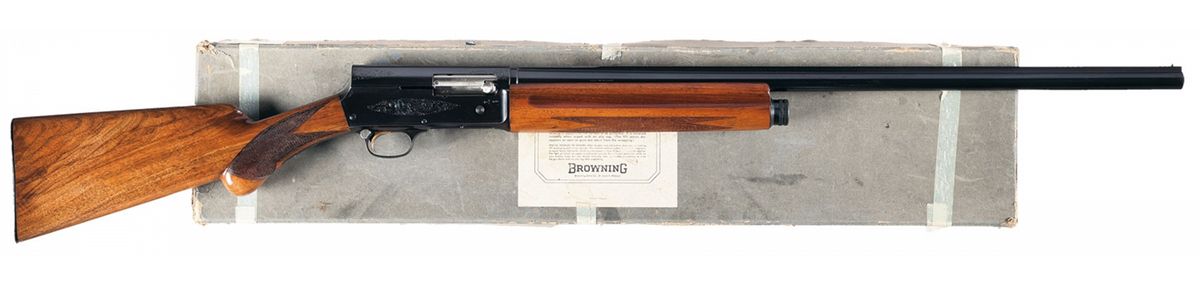 Manufactured circa 1954 with a single steel bead sight on a matte solid rib, choked full and a 2 3/4 inch chamber. Mounted on a multi-point checkered finger groove walnut forearm and round knob pistol grip stock with horn FN buttplate. With early blue Browning box.