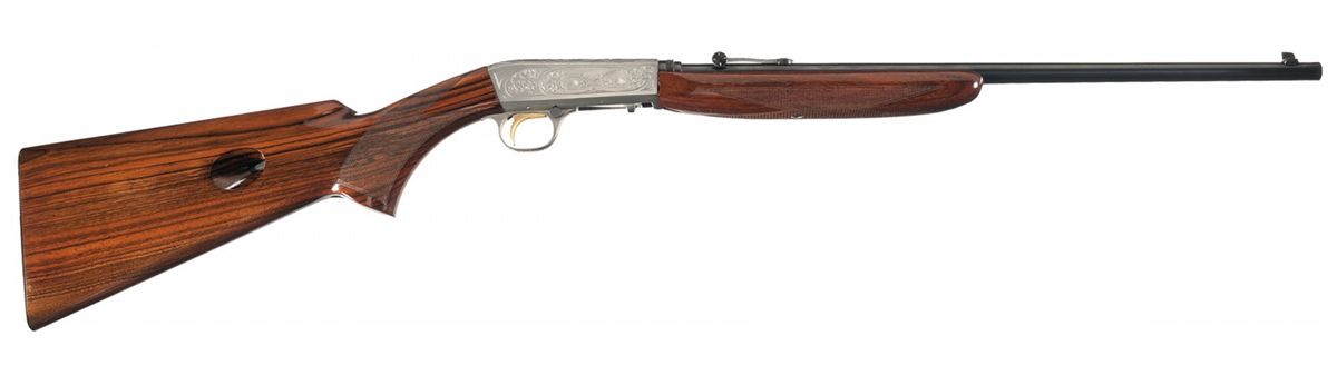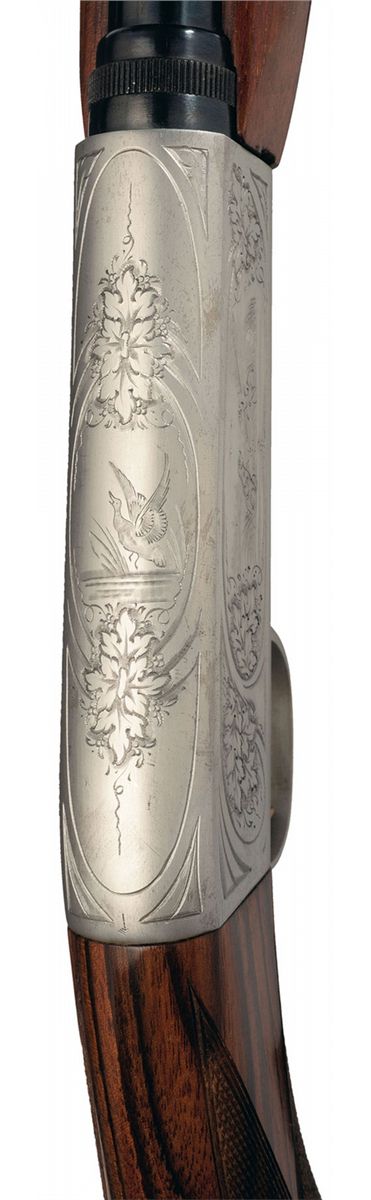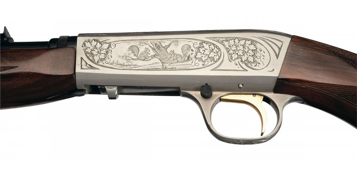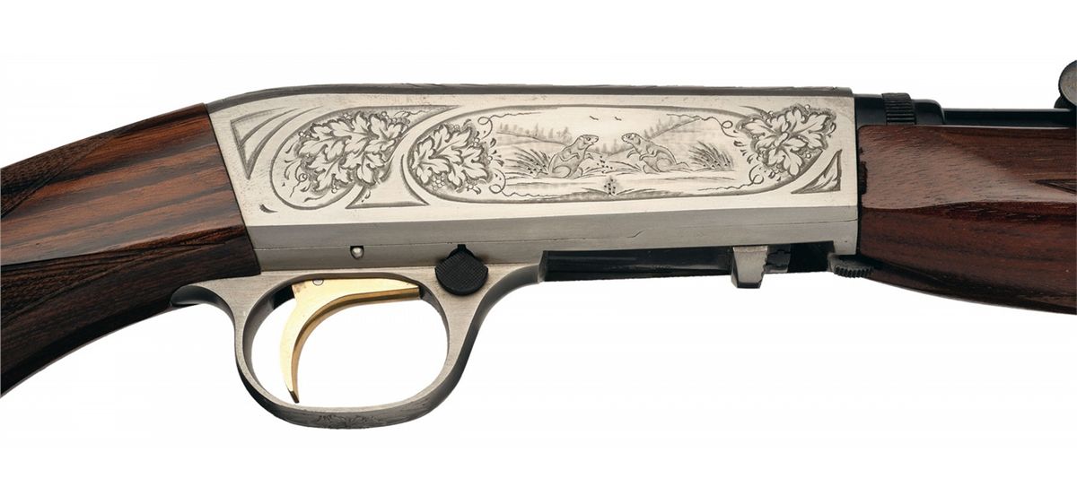 Manufactured in Belgium in 1958 with blade and adjustable notch sights. Receiver has the Grade I game scenes. Nicely figured checkered pistol grip stock with serrated buttplate.