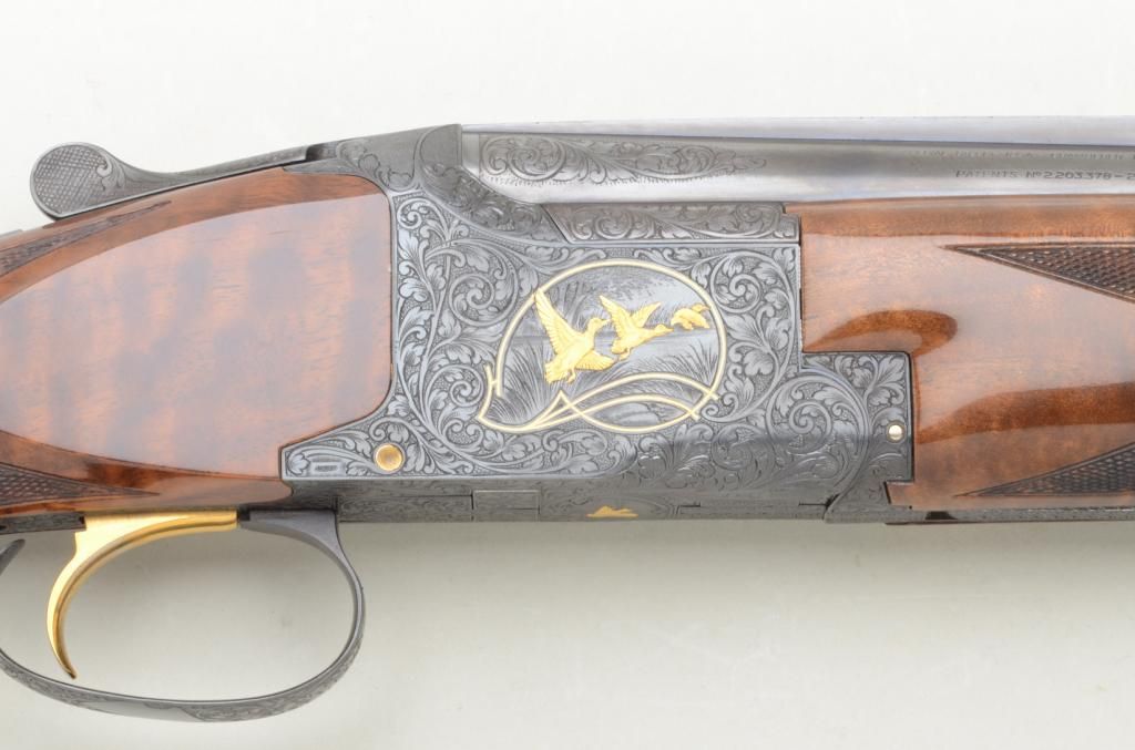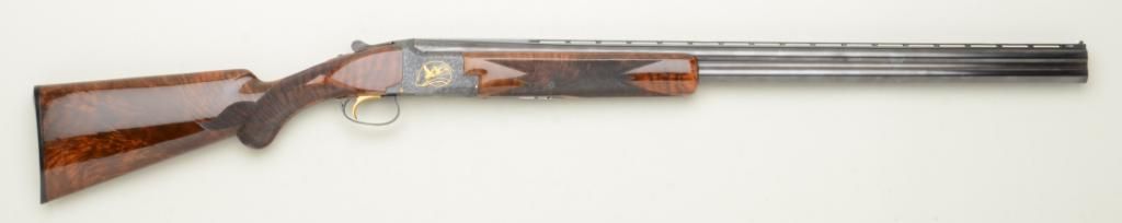Belgian Browning Midas Grade 12 gauge O/U shotgun, showing long tang, round knob, serial #69652S7. The gun shows 30" barrels, choked 1 star over 2 stars, single trigger, auto ejector, low rise ventilated rib. Theengraving is signed A. Bee on left and right. The gun remains in fine to excellent condition showing slight evidence of minor use, 98-99% original blue, beautiful checkered select burl walnut stocks withoriginal hard rubber butt plate. The engraving shows typical high quality with deep cut scrolls, 7 gold inlays, gold plated firing pin and trigger. Est.: $7,000-$14,000