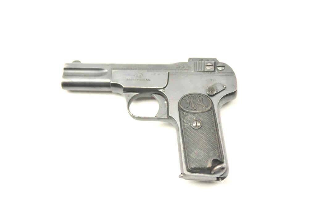 Belgian Browning Model 1900 Pocket semi-automatic pistol, .32 caliber, Serial #463274. The FN manufactured pistol is in fine overall condition with numerous Belgian proofs and acceptance marks, all matchingserial numbers and light holster wear at the muzzle. The pistol retains 95-96% of the original toning blue finish. The FN marked checkered hard rubber grips are in very good condition showing light wear with a good fit. The bore is bright, the action is crisp and the markings are sharp on this desirable FN manufactured Browning. The lot includes one correct magazine. Est.: $350-$700. (C+R/PPT).
